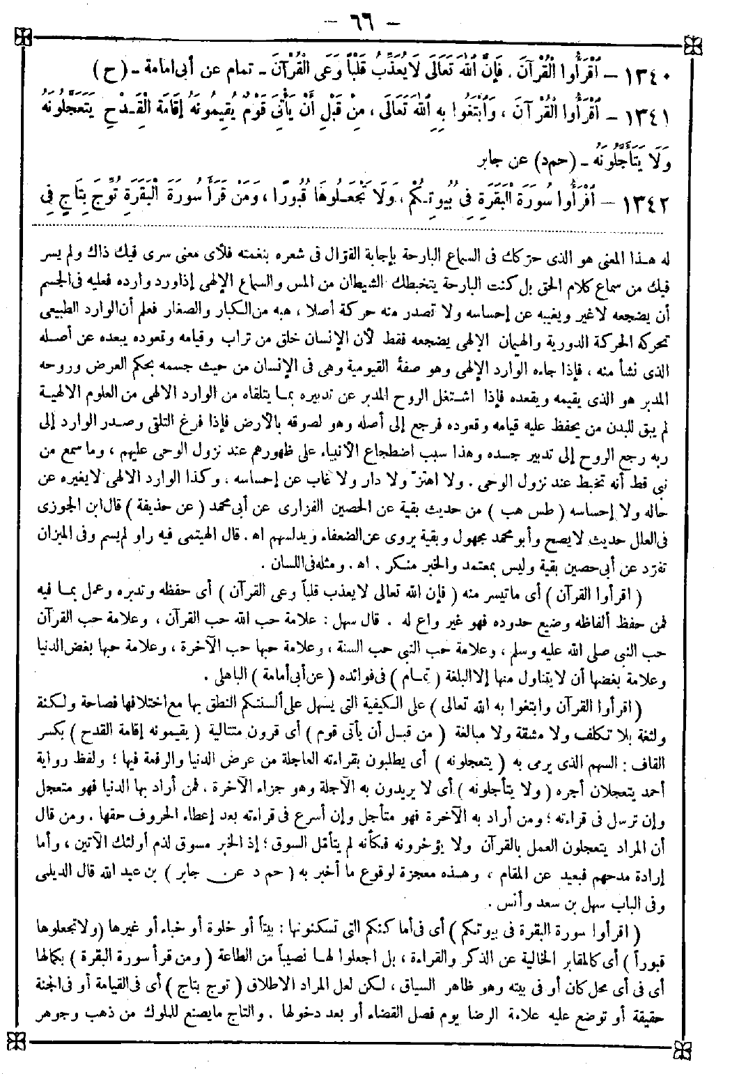 1342 - (اقرأوا سورة البقرة في بيوتكم) أي في أماكنكم التي تسكنوها: بيتا أو خلوة أو خباء أو غيرها (ولا تجعلوها قبورا) أي كالمقابر الخالية عن الذكر والقراءة بل اجعلوا لها نصيبا من الطاعة (ومن قرأ سورة البقرة) بكاملها أي في أي محل كان أو في بيته وهو ظاهر السياق لكن لعل المراد الإطلاق (توج بتاج) أي في القيامة أو في الجنة حقيقة أو توضع عليه علامة الرضا يوم فصل القضاء أو بعد دخولها. والتاج ما يصنع للملوك من ذهب وجوهر. -[67]- قال الطيبي: ذكر التاج كناية عن الملك والسيادة كما يقال قعد فلان على السرير كناية عنه