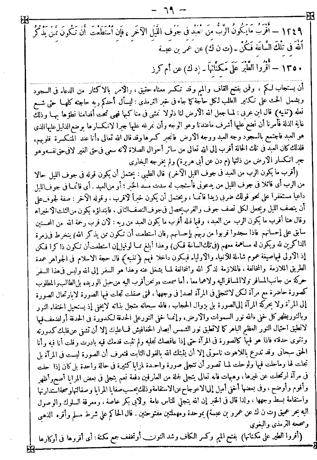 1349 - (أقرب ما يكون الرب من العبد في جوف الليل الآخر) قال الطيبي: يحتمل أن يكون قوله في جوف الليل حالا من الرب أي قائلا في جوف الليل من يدعوني فأستجب له سدت مسد الخير أو من العبد أي قائما في جوف الليل داعيا مستغفرا على نحو قولك ضربي زيدا قائما ويحتمل أن يكون خبرا لأقرب وقوله الآخر: صفة لجوف على أن ينصف الليل ويجعل لكل نصف جوف والقرب يحصل في جوف النصف الثاني فابتداؤه يكون من الثلث الأخير أه وقال هنا أقرب ما يكون الرب من العبد وفيما قبله أقرب ما يكون العبد من ربه: لأن قرب رحمة الله من المحسنين سابق على إحسانهم فإذا سجدوا قربوا من ربهم بإحسانهم (فإن استطعت أن تكون ممن يذكر الله) ينخرط في زمرة الذاكرين لله ويكون له مساهمة معهم (في تلك الساعة فكن) وهذا أبلغ مما لو قيل إن استطعت أن تكون ذاكرا فكن إذ الأولى فيها صيغة عموم شاملة للأنبياء والأولياء فيكون داخلا فيهم <تنبيه> قال حجة الإسلام في الجواهر عمدة الطريق الملازمة والمخالفة فالملازمة لذكر الله والمخالفة لما يشغل عنه وهذا هو السفر إلى الله وليس في هذا السفر حركة من جانب المسافر ولا المسافر إليه ولا هما معا أما سمعت {ونحن أقرب إليه من حبل الوريد} بل الطالب والمطلوب كصورة حاضرة مع مرآة لكن لا تنجلى على المرآة لصدأ في وجهها فمتى صقلت تجلت فيها الصورة لا بارتحال الصورة إلى المرآة ولا بحركة المرآة إلى الصورة بل بزوال الحجاب فالله سبحانه متجل بذاته لا يخفى إذ يستحيل اختفاء النور وبالنور يظهر كل خفي {الله نور السماوات والأرض} وإنما خفي النور على الحدقة لكدورة في الحدقة أو لضعف فيها لا تطيق احتمال النور العظيم الباهر كما لا تطيق نور الشمس أبصار الخفافيش فما عليك إلا أن تشفي عن قلبك كدورته وتقوي حدقته فإذا هو فيها كالصورة في المرآة حتى إذا عاقصك تجليه ولم تثبت قدمك فيه بادرت وقلت أنا فيه وأنا الحق سبحاني وقد تدرع باللاهوت ناسوتي إلا أن يثبتك الله بالقول الثابت فتعرف أن الصورة ليست في المرآة بل تجلت لها وما حلت فيها ولو حلت لما تصور أن تتجلى صورة واحدة لمزايا كثيرة في حالة واحدة بل كان إذا حلت في مرآة ارتحلت عن غيرها وهيهات فإنه تعالى يتجلى لجملة من العارفين دفعة نعم يتجلى في بعض المرايا أصح وأظهر وأقوم وأوضح وفي بعضها أخفى أميل إلى الاعوجاج عن الاستقامة وذلك بحسب صفايا المرايا وصقالتها وصحة استدارتها واستقامة بسط وجهها ولذا قال في الخبر إن الله يتجلى للناس عامة ولأبي بكر خاصة ومعرفة السلوك والوصول إليه بحر عميق