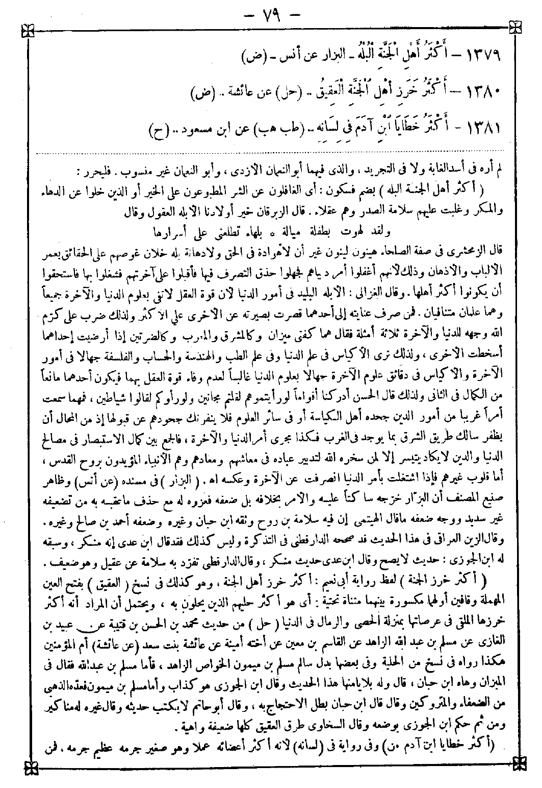 1379 - (أكثر أهل الجنة البله) بضم فسكون: أي الغافلون عن الشر المطبوعون على الخير أو الذين خلوا عن الدهاء والمكر وغلبت عليهم سلامة الصدر وهم عقلاء قال الزبرقان خير أولادنا الأبله العقول وقال: