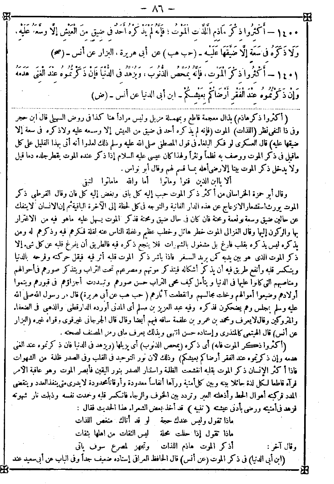 -[86]- 1400 - (أكثروا ذكر هاذم) بذال معجمة قاطع وبمهملة مزيل وليس مرادا هنا كذا في روض السهيلي قال ابن حجر وفي ذا النفي نظر (اللذات) الموت (فإنه لم يذكره أحد في ضيق من العيش إلا وسعه عليه ولا ذكره في سعة إلا ضيقها عليه) قال العسكري لو فكر البلغاء في قول المصطفى صلى الله عليه وسلم ذلك لعلموا أنه أتى بهذا القليل على كل ما قيل في ذكر الموت ووصف به نظما ونثرا ولهذا كان عيسى عليه السلام إذا ذكر عنده الموت يقطر جلده دما قيل ولا يدخل ذكر الموت بيتا إلا رضي أهله بما قسم لهم وقال أبو نواس