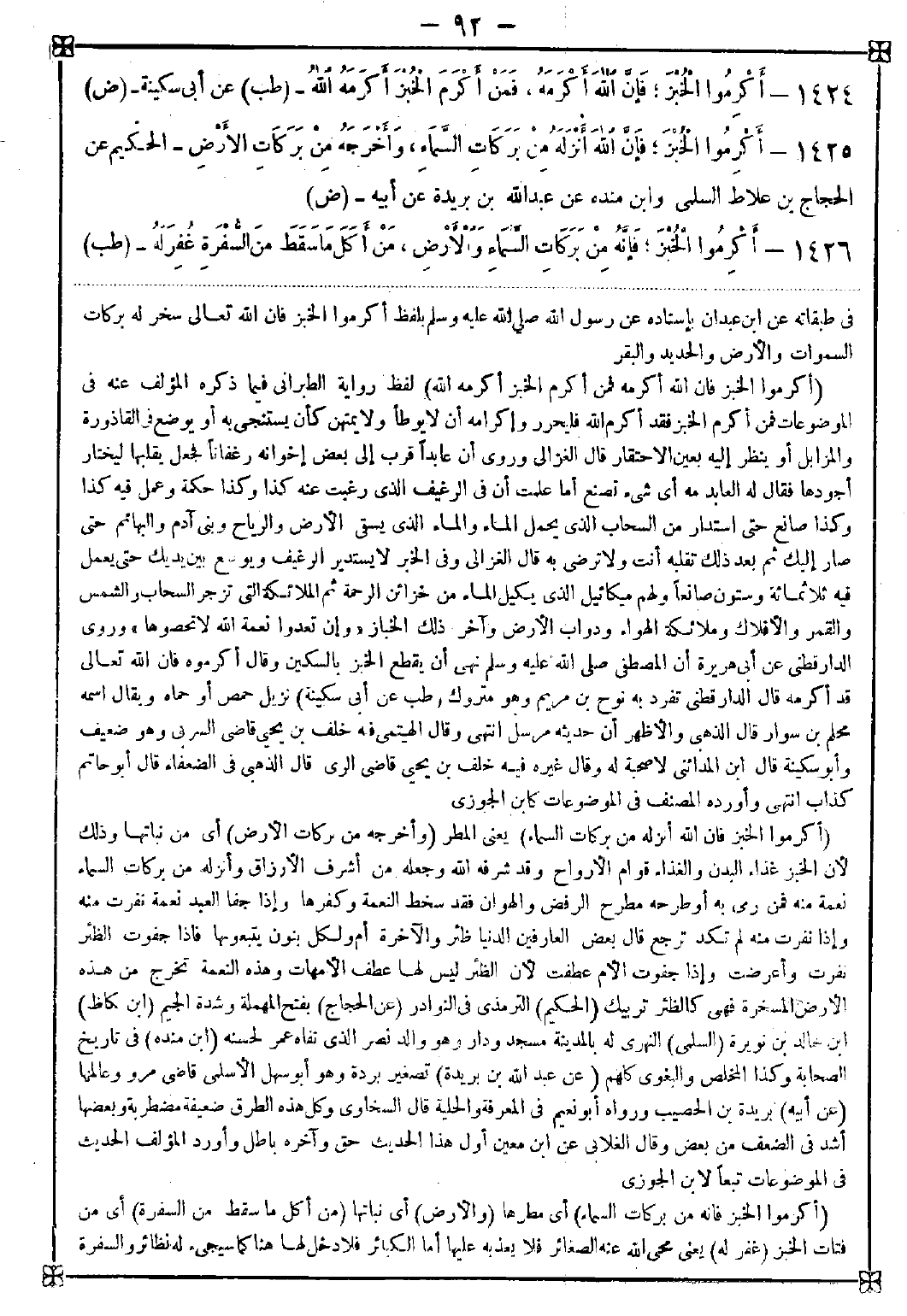 1424 - (أكرموا الخبز فإن الله أكرمه فمن أكرم الخبز أكرمه الله) لفظ رواية الطبراني فيما ذكره المؤلف عنه في الموضوعات فمن أكرم الخبز فقد أكرم الله فليحرر وإكرامه أن لا يوطأ ولا يمتهن كأن يستنجى به أو يوضع في القاذورة والمزابل أو ينظر إليه بعين الاحتقار قال الغزالي: وروى أن عابدا قرب إلى بعض إخوانه رغفانا فجعل يقلبها ليختار أجودها فقال له العابد: مه أي شيء تصنع أما علمت أن في الرغيف الذي رغبت عنه كذا وكذا حكمة وعمل فيه كذا وكذا صانع حتى استدار من السحاب الذي يحمل الماء والماء الذي يسقي الأرض والرياح وبني آدم والبهائم حتى صار إليك ثم بعد ذلك تقلبه أنت ولا ترضى به قال الغزالي: وفي الخبر لا يستدير الرغيف ويوضع بين يديك حتى يعمل به ثلاث مئة وستون صانعا أولهم ميكائيل الذي يكيل الماء من خزائن الرحمة ثم الملائكة التي تزجر السحاب والشمس والقمر والأفلاك وملائكة الهواء وداوب الأرض وآخر ذلك الخباز {وإن تعدوا نعمة الله لا تحصوها} وروى الدارقطني عن أبي هريرة أن المصطفى صلى الله عليه وسلم نهى أن يقطع الخبز بالسكين وقال أكرموه فإن الله تعالى قد أكرمه قال الدارقطني تفرد به نوح بن مريم وهو متروك
