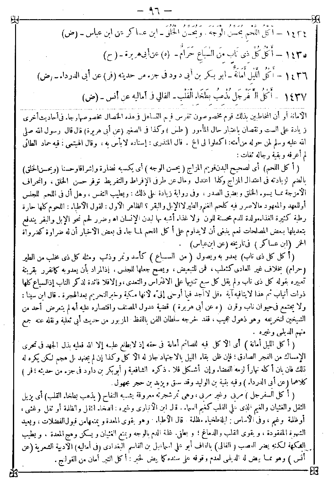 1435 - (أكل كل ذي ناب) يعدو به ويصول (من السباع) كأسد ونمر وذئب ومثله كل ذي مخلب من الطير (حرام) بخلاف غير العادي كثعلب فمن للتبعيض ويصح جعلها للجنس إذ المراد بأن يعدو به كما تقرر بقرينة تعبيره بقوله كل ذي ناب ولم يقل كل سبع تنبيها على الافتراس والتعدي وإلا فلا فائدة لذكر الناب إذ السباع كلها ذو أنياب ثم هذا لا ينافيه آية {قل لا أجد فيما أوحى إلي} لأنها مكية وخبر التحريم بعد الهجرة. قال ابن سينا: ولا يجتمع في حيوان ناب وقرن