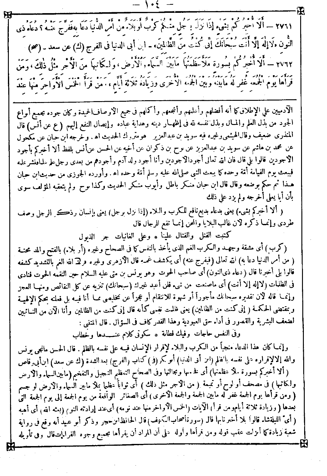 2862 - (ألا أخبركم بسورة ملأ عظمتها) أي فخمها وبجالتها وفي الصحاح التعظيم التبجيل والتفخيم (ما بين السماء والأرض ولكاتبها) في مصحف أو لوح أو تميمة (من الأجر مثل ذلك) أي ثوابا عظيما يملأ ما بين السماء والأرض لو جسم (ومن قرأها يوم الجمعة غفر له ما بين الجمعة والجمعة الأخرى) أي الصغائر الواقعة من يوم الجمعة إلى يوم الجمعة التي بعدها (وزيادة ثلاثة أيام ومن قرأ) الآيات (الخمس الأواخر منها عند نومه) أي عند إرادته النوم (بعثه الله) أي أهبه (أي الليل شاء) قالوا: بلى أخبرنا بها قال: (سورة أصحاب الكهف) قال الحافظ ابن حجر: وذكر أبو عبيد أنه وقع في رواية شعبة زيادة كما أنزلت عقب قوله ومن قرأها وأوله على أن المراد أن يقرأها بجميع وجوه القراءات قال: وفي تأويله -[105]- نظر والمتبادر أن المراد يقرؤها كلها بغير نقص حسا ولا معنى وقد يشكل بما رود من زيادة أحرف ليست من المشهورة ك " سفينة صالحة " ونحو " وأما الغلام فكان كافرا " أو يجاب بأن المراد المتعبد بتلاوته