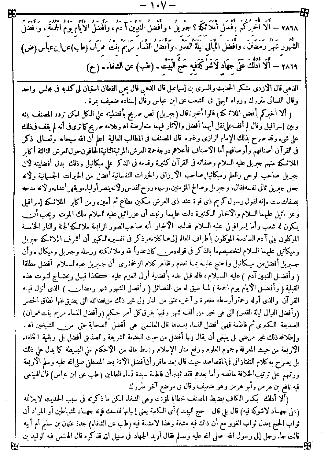 2868 - (ألا أخبركم بأفضل الملائكة) قالوا: أخبرنا قال: (جبريل) نص صريح بأفضليته على الكل لكن تردد المصنف بينه وبين إسرافيل وقال: لم أقف على نقل أيهما أفضل والآثار فيهما متعارضة اه وكلامه صريح كما ترى في أنه لم يقف في ذلك على شيء وقد صرح بذلك الإمام الرازي وغيره قال المصنف في المطالب العالية: اعلم أن الله سبحانه وتعالى ذكر في القرآن أصنافهم وأوصافهم أما الأصناف فأعلاهم درجة حملة العرش المرتبة الثانية الحافون حول العرش الثالثة أكابر الملائكة منهم جبريل عليه السلام وصفاته في القرآن كثيرة وقدمه في الذكر على ميكائيل وذلك يدل أفضليته لأن جبريل صاحب الوحي والعلم وميكائيل صاحب الأرزاق والخيرات النفسانية أفضل من الخيرات الجسمانية ولأنه جعل جبريل ثاني نفسه فقال: {وجبريل وصالح المؤمنين} وسماه روح القدس ولأنه ينصر أولياءه ويقهر أعداءه ولأنه مدحه بصفات ست {إنه لقول رسول كريم ذي قوة عند ذي العرش مكين مطاع ثم أمين} ومن أكابر الملائكة إسرافيل وعزرائيل عليهما السلام والأخبار كثيرة دلت عليهما وثبت أن عزرائيل عليه السلام ملك الموت ويجب أن يكون له شعب وأما إسرافيل عليه السلام فدلت الأخبار أنه صاحب الصور الرابعة ملائكة الجنة والنار الخامسة الموكلون ببني آدم السادسة الموكلون بأطراف العالم. إلى هنا كلامه. وذكر في تفسيره الكبير أن أشرف الملائكة جبريل وميكائيل عليهما السلام لتخصيصهما بالذكر في قوله {من كان عدوا لله وملائكته ورسله وجبريل وميكال} وأن جبريل أفضل من ميكائيل واحتج عليه بما تقدم وظاهر كلام الزمخشري أن جبريل عليه السلام أفضل مطلقا (وأفضل النبيين آدم) عليه السلام قاله قبل علمه بأفضلية أولي العزم عليه كذا قيل ويحتاج لثبوت هذه القبلية (وأفضل الأيام يوم الجمعة) لما سبق له من الفضائل (وأفضل الشهور شهر رمضان) الذي أنزل فيه القرآن والذي أوله رحمة وأوسطه مغفرة وآخره عتق من النار إلى غير ذلك من فضائله التي يضيق عنها نطاق الحصر (وأفضل الليالي ليلة القدر) التي هي خير من ألف شهر وفيها يفرق كل أمر حكيم (وأفضل النساء مريم بنت عمران) الصديقة الكبرى ثم فاطمة فهي أفضل النساء بعدها قال العلقمي: هي أفضل الصحابة حتى من الشيخين اه. وإطلاقه ذلك غير مرضي بل ينبغي أن يقال إنها أفضل من حيث البضعة الشريفة والصديق أفضل بل وبقية الخلفاء الأربعة من حيث المعرفة وجموم العلوم ورفع منار الإسلام وبسط ماله من الأحكام على البسيطة كما يدل على ذلك بل يصرح به كلام التفتازاني في المقاصد حيث قال بعد ما قرر أن أفضل الأمة بعد المصطفى صلى الله عليه وسلم الأربعة ورتبهم على ترتيب الخلافة ما نصه وأما بعدهم فقد ثبت أن فاطمة سيدة نساء العالمين