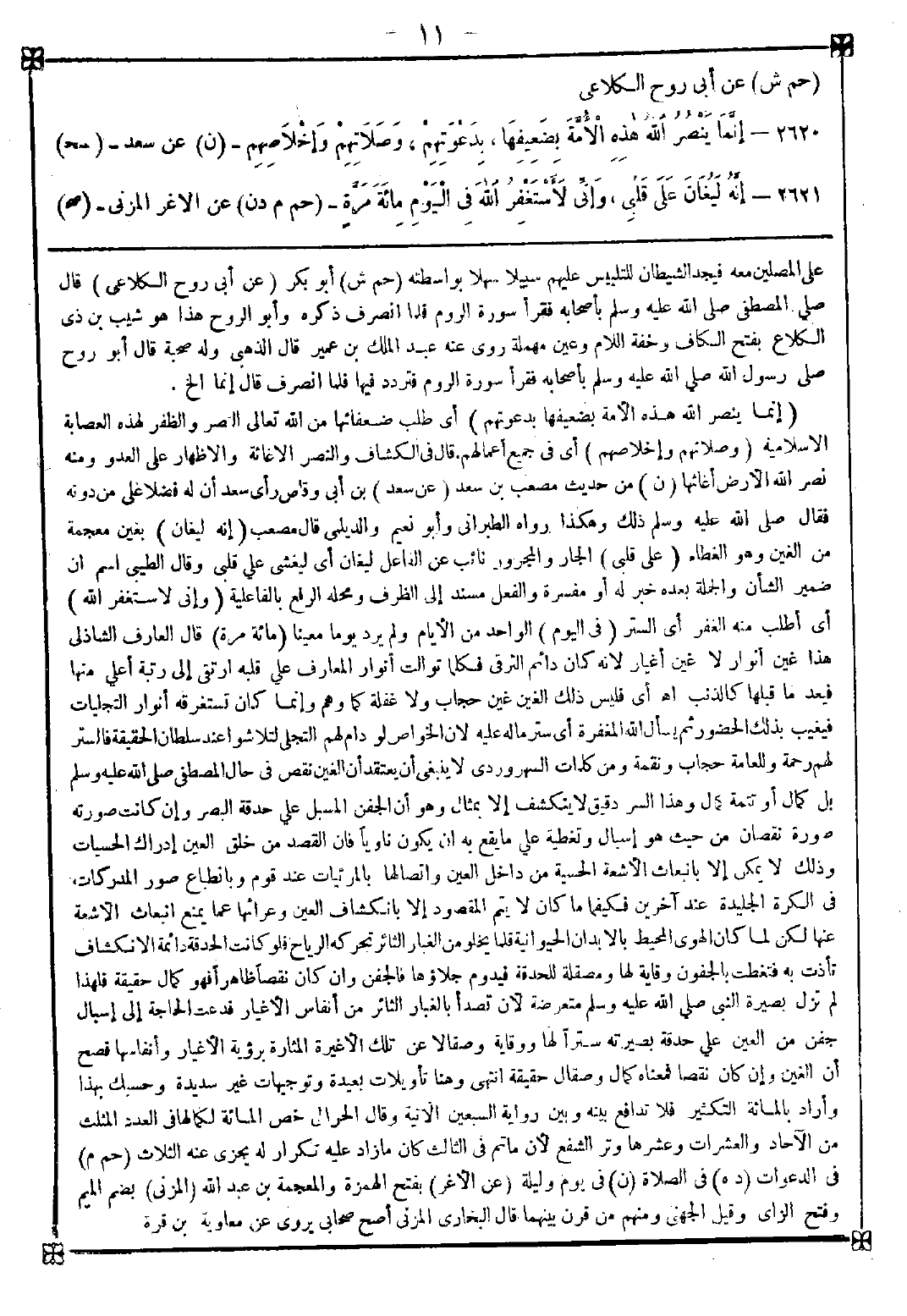 2620 - (إنما ينصر الله هذه الأمة بضعيفها بدعوتهم) أي طلب ضعفائها من الله تعالى النصر والظفر لهذه العصابة الإسلامية (وصلاتهم وإخلاصهم) أي في جميع أعمالهم. قال في الكشاف: والنصر الإغاثة والإظهار على العدو ومنه نصر الله الأرض أغاثها