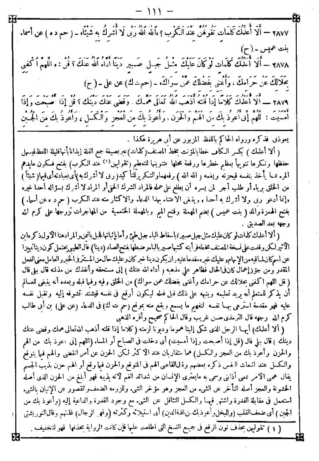 2878 - (ألا أعلمك كلمات لو كان عليك مثل جبل صبير) بإسقاط الباء جبل طيء وأما بإثباتها فجبل باليمن والمراد هنا الأول ذكره ابن الأثير لكن وقفت على نسخة المصنف بخطه فرأيته كتبها صبير بالباء وضبطها بفتح الصاد (دينا) قال الطيبي: يحتمل كون دينا تمييزا عن اسم كان لما فيه من الإيهام وعليك خبره مقدما عليه وأن يكون دينا خير كان وعليك حال من المستتر في الخبر والعامل معنى الفعل المقدر ومن جوز إعمال كان في الحال فظاهر على مذهبه (أداه الله عنك) إلى مستحقه وأنقذك من مذلته قال: بلى قال: (قل اللهم اكفني بحلالك عن حرامك وأغنني بفضلك عمن سواك) من الخلق وفيه وفيما قبله وبعده أنه ينبغي للعالم أن يذكر للمتعلم أنه يريد تعليمه وينبهه على ذلك قبل فعله ليكون أوقع في نفسه فيشتد تشوقه إليه وتقبل نفسه عليه فهو مقدمة استرعى بها نفسه لتفهيم ما يسمع ويقع منه بموقع