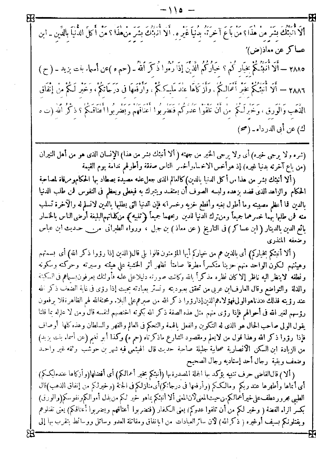 2886 - (ألا) قال القاضي: حرف تنبيه يؤكد بها الجملة المصدرة بها (أنبئكم بخير أعمالكم) أي أفضلها (وأزكاها عند مليككم) أي أنماها وأطهرها عند ربكم ومالككم (وأرفعها في درجاتكم) أي منازلكم في الجنة (وخير لكم من إنفاق الذهب) قال الطيبي: مجرور عطف على خير أعمالكم من حيث المعنى لأن المعنى ألا أنبئكم بما هو خير لكم من بذل أموالكم ونفوسكم (والورق) بكسر الراء الفضة (وخير لكم من أن تلقوا عدوكم) يعني الكفار (فتضربوا أعناقهم ويضربوا أعناقكم) يعني تقتلوهم ويقتلونكم بسيف أو غيره (ذكر الله) لأن سائر العبادات من الإنفاق ومقاتلة العدو وسائل ووسائط يتقرب بها إلى -[116]- الله تعالى والذكر هو المقصود الأسنى ورأس الذكر قول لا إله إلا الله وهي الكلمة العليا وهي القطب الذي يدور عليه رحى الإسلام والقاعدة التي بني عليها أركان الدين والشعبة التي هي أعلى شعب الإيمان بل هي الكل وليس غيره {قل إنما يوحى إلي أنما الهكم إله واحد} أي الوحي مقصور على استئثار الله بالوحدانية لأن القصد الأعظم من الوحي التوحيد {وما أمروا إلا ليعبدوا الله} ولأمر ما تجد العارفين يؤثرونها على جميع الأذكار لما فيها من الخواص التي لا طريق إلى معرفتها إلا الوجدان والذوق قالوا: وهذا محمول على أن الذكر كان أفضل للمخاطبين به ولو خوطب به شجاع باسل حصل به نفع الإسلام في القتال لقيل له الجهاد أو الغنى الذي ينتفع به الفقراء بماله قيل له الصدقة والقادر على الحج قيل له الحج أو من له أصلان قيل له برهما وبه يحصل التوفيق بين الأخبار وقال ابن حجر: المراد بالذكر هنا الذكر الكامل وهو ما اجتمع فيه ذكر اللسان والقلب بالشكر واستحضار عظمة الرب وهذا لا يعدله شيء وأفضل الجهاد وغيره إنما هي بالنسبة إلى ذكر اللسان المجرد وهذا الحديث يقتضي أن الذكر أفضل من تلاوة القرآن وقضية الحديث المار وهو قوله أفضل عبادة أمتي تلاوة القرآن يقتضي عكسه فوقع التعارض بينهما وجمع الغزالي بأن القرآن أفضل لعموم الخلق والذكر أفضل للذاهب إلى الله في جميع أحواله في بدايته ونهايته فإن القرآن مشتمل على صنوف المعارف والأحوال والإرشاد إلى الطريق فما دام العبد مفتقرا إلى تهذيب الأخلاق وتحصيل المعارف فالقرآن أولى له فإن جاوز ذلك واستولى الذكر على قلبه فمداومة الذكر أولى به فإن القرآن يجاذب خاطره ويسرح به في رياض الجنة والذاهب إلى الله لا ينبغي أن يلتفت إلى الجنة بل يجعل همه هما واحدا وذكره ذكرا واحدا ليدرك درجة الفناء والاستغراق ولذلك قال تعالى: {ولذكر الله أكبر} . <تنبيه> أخذ ابن الحاج من ذلك ترك طلب الدنيا أعظم عند الله من أخذها والتصدق بها وأيده بما في القوت عن الحسن أنه لا شيء أفضل من رفض الدنيا وبما في غيره عنه أنه سئل عن رجلين طلب أحدهما الدنيا بحلالها فأصابها فوصل بها رحمه وقدم فيها لنفسه وترك الآخر الدنيا فقال: أحبهما إلي الذي جانب الدنيا. (تنبيه آخر) قد أخذ الصوفية بقضية هذا الحديث فذهبوا أنه لا طريق إلى الوصول إلا الذكر قالوا: فالطريق في ذلك أولا أن يقطع علائق الدنيا بالكلية ويفرغ قلبه عن الأهل والمال والولد والوطن والعلم والولاية والجاه ويصير قلبه إلى حالة يستوي عنده فيها وجود ذلك وعدمه ثم يخلو بنفسه مع الاقتصار على الفرض والراتبة ويقعد فارغ القلب مجموع الهم ولا يفرق فكره بقراءة ولا غيرها بل يجتهد أن لا يخطر بباله شيء سوى ذكر الله فلا يزال قائلا بلسانه الله الله على الدوام مع حضور قلبه إلى أن ينتهي إلى حالة يترك تحريك اللسان ويرى كأن الكلمة جارية عليه ثم يصير إلى أن ينمحي أثره من اللسان فيصادف قلبه مواظبا على الذكر ثم تنمحي صورة اللفظ ويبقى معنى الكلمة مجردا في قلبه لا يفارقه وعند ذلك انتظار الفتح ورد عليهم النظار وذوي الاعتبار بما حاصله أن تقديم تعلم العلم أوفق وأقرب إلى الغرض ثم لا بأس أن يعقبه بالمجاهدة المذكورة