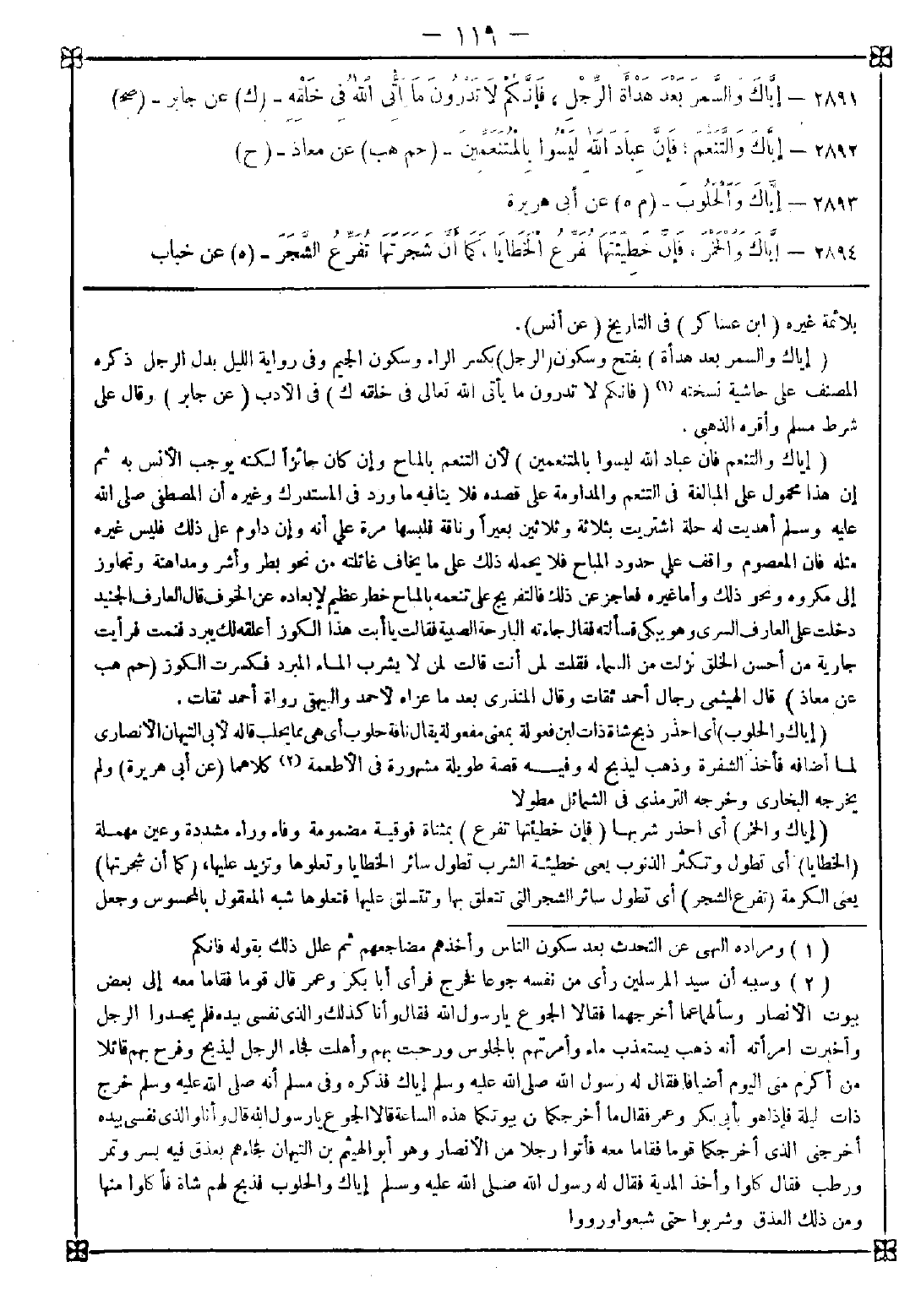 2892 - (إياك والتنعم فإن عباد الله ليسوا بالمتنعمين) لأن التنعم بالمباح وإن كان جائزا لكنه يوجب الأنس به ثم إن هذا محمول على المبالغة في التنعم والمداومة على قصده فلا ينافيه ما ورد في المستدرك وغيره أن المصطفى صلى الله عليه وسلم أهديت له حلة اشتريت بثلاثة وثلاثين بعيرا وناقة فلبسها مرة على أنه وإن داوم على ذلك فليس غيره مثله فإن المعصوم واقف على حدود المباح فلا يحمله ذلك على ما يخاف غائلته من نحو بطر وأشر ومداهنة وتجاوز إلى مكروه ونحو ذلك وأما غيره فعاجز عن ذلك فالتفريج على تنعمه بالمباح خطر عظيم لإبعاده عن الخوف قال العارف الجنيد: دخلت على العارف السري وهو يبكي فسألته فقال: جاءته البارحة الصبية فقالت: يا أبت هذا الكوز أعلقه لك يبرد فنمت فرأيت جارية من أحسن الخلق نزلت من السماء فقلت: لمن أنت قالت: لمن لا يشرب الماء المبرد فكسرت الكوز