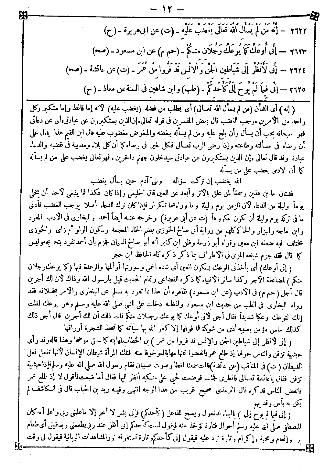 -[12]- 2622 - (إنه) أي الشأن (من لم يسأل الله تعالى) أي يطلب من فضله (يغضب عليه) لأنه إما قانط وإما متكبر وكل واحد من الأمرين موجب الغضب قال بعض المفسرين في قوله تعالى {إن الذين يستكبرون عن عبادتي} أي عن دعائي فهو سبحانه يحب أن يسأل وأن يلح عليه ومن لم يسأله يبغضه والمبغوض مغضوب عليه قال ابن القيم: هذا يدل على أن رضاه في مسألته وطاعته وإذا رضي الرب تعالى فكل خير في رضاه كما أن كل بلاء ومصيبة في غضبه والدعاء عبادة وقد قال تعالى {إن الذين يستكبرون عن عبادتي سيدخلون جهنم داخرين} فهو تعالى يغضب على من لم يسأله كما أن الآدمي يغضب على من يسأله