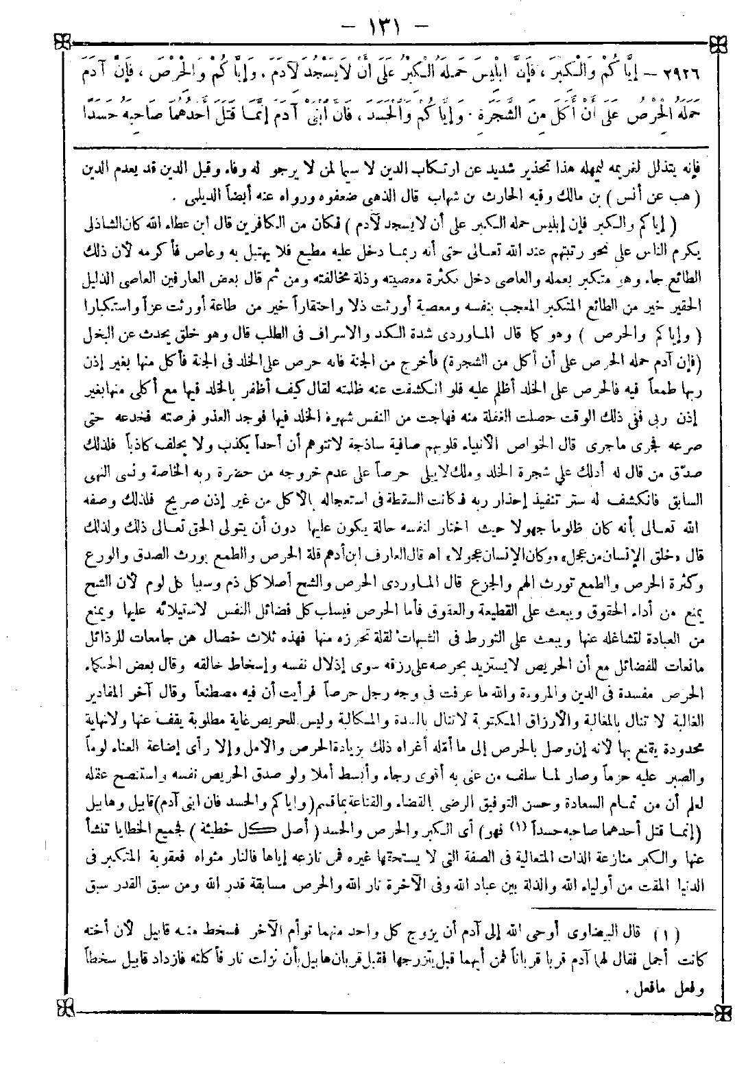 2926 - (إياكم والكبر فإن إبليس حمله الكبر على أن لا يسجد لآدم) فكان من الكافرين قال ابن عطاء الله: كان الشاذلي يكرم الناس على نحو رتبتهم عند الله تعالى حتى أنه ربما دخل عليه مطيع فلا يهتبل به وعاص فأكرمه لأن ذلك الطائع جاء وهو متكبر بعمله والعاصي دخل بكثرة معصيته وذلة مخالفته ومن ثم قال بعض العارفين: العاصي الذليل الحقير خير من الطائع المتكبر المعجب بنفسه ومعصية أورثت ذلا واحتقارا خير من طاعة أورثت عزا واستكبارا (وإياكم والحرص) وهو كما قال الماوردي: شدة الكد والاسراف في الطلب قال: وهو خلق يحدث عن البخل (فإن آدم حمله الحرص على أن أكل من الشجرة) فأخرج من الجنة فإنه حرص على الخلد في الجنة فأكل منها بغير إذن ربها طمعا فيها فالحرص على الخلد أظلم عليه فلو انكشفت عنه ظلمته لقال كيف أظفر بالخلد فيها مع أكلي منها بغير إذن ربي ففي ذلك الوقت حصلت الغفلة منه فهاجت من النفس شهوة الخلد فيها فوجد العدو فرصته فخدعه حتى صرعه فجرى ما جرى قال الخواص: الأنبياء قلوبهم صافية ساذجة لا تتوهم أن أحدا يكذب ولا يحلف كاذبا فلذلك صدق من قال له أدلك على شجرة الخلد وملك لا يبلى حرصا على عدم خروجه من حضرة ربه الخاصة ونسي النهي السابق فانكشف له ستر تنفيذ احذار ربه فكانت السقطة في استعجاله بالأكل من غير إذن صريح فلذلك وصفه الله تعالى بأنه كان ظلوما جهولا حيث اختار لنفسه حالة يكون عليها دون أن يتولى الحق تعالى ذلك ولذلك قال: {خلق الإنسان من عجل} {وكان الإنسان عجولا} اه قال العارف ابن أدهم: قلة الحرص والطمع يورث الصدق والورع وكثرة الحرص والطمع تورث الهم والجذع قال الماوردي: الحرص والشح أصلا كل ذم وسببا كل لوم لأن الشح يمنع من أداء الحقوق ويبعث على القطيعة والعقوق فأما الحرص فيسلب كل فضائل النفس لاستيلائه عليها ويمنع من العبادة لتشاغله عنها ويبعث على التورط في الشبهات لقلة تحرزه منها فهذه ثلاث خصال هن جامعات للرذائل مانعات للفضائل مع أن الحريص لا يستزيد بحرصه على رزقه سوى إذلال نفسه وإسخاط خالقه. وقال بعض الحكماء: الحرص مفسدة في الدين والمروءة والله ما عرفت في وجه رجل حرصا فرأيت أن فيه مصطنعا وقال آخر: المقادير الغالبة لا تنال بالمغالبة والأرزاق المكتوبة لا تنال بالشدة والمكالبة وليس للحريص غاية مطلوبة يقف عنها ولا نهاية محدودة يقنع بها لأنه إن وصل بالحرص إلى ما أمله أغراه ذلك بزيادة الحرص والأمل وإلا رأى إضاعة العناء لوما والصبر عليه حزما وصار لما سلف من عني به أقوى رجاء وأبسط أملا ولو صدق الحريص نفسه واستنصح عقله لعلم أن من تمام السعادة وحسن التوفيق الرضا بالقضاء والقناعة بما قسم (وإياكم والحسد فإن ابني آدم) قابيل وهابيل (إنما قتل أحدهما صاحبه حسدا (1) فهو) أي الكبر والحرص والحسد (أصل كل خطيئة) فجميع الخطايا تنشأ عنها والكبر منازعة الذات المتعالية في الصفة التي لا يستحقها غيره فمن نازعه إياها فالنار مثواه فعقوبة المتكبر في الدنيا المقت من أولياء الله والذلة بين عباد الله وفي الآخرة نار الله والحرص مسابقة قدر الله ومن سبق القدر سبق -[132]- وهو مغالبة الحق تقدس ومن غالبه غلب فعقوبته في الدنيا الحرمان وفي الآخرة النيران والحسد تسخط قضاء الله فيما لا عذر للعبد فيه فعقوبته في الدنيا الغيظ الشديد وفي الآخرة نار الوعيد وخص هذه الثلاثة بالذكر لأنها أصول الشر قال الحرالي: أصول الشر ثلاثة الكبر الذي كان سبب بلاء إبليس والحرص الذي كان سبب بلاء آدم عليه السلام من الشجرة والحسد الذي كان سبب قتل قابيل هابيل وقال أبو حاتم: أحيد الموت خوفا من ثلاثة أشياء الكبر والحرص والخيلاء فإن المتكبر لا يخرجه الله من الدنيا حتى يريه الهوان من أرذل أهله وخدامه والحريص لا يخرجه من الدنيا حتى يحوجه إلى كسرة أو شربة والمختال لا يخرجه منها حتى يمرغه ببوله وقذره