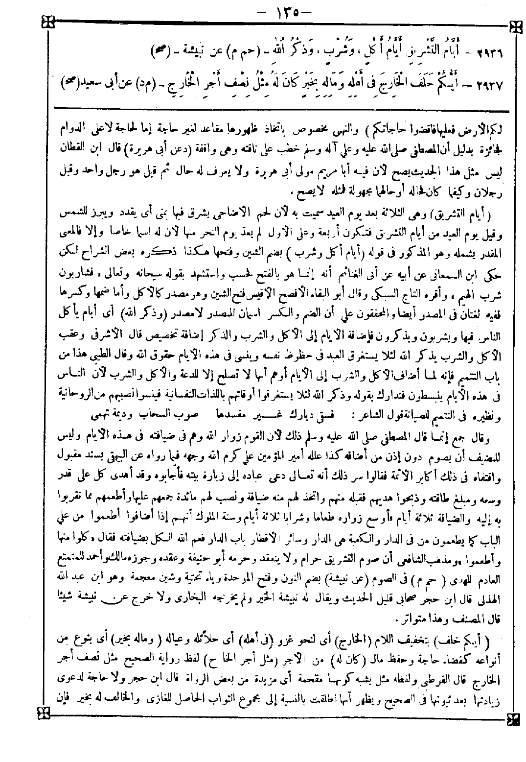 2936 - (أيام التشريق) وهي الثلاثة بعد يوم العيد سميت به لأن لحم الأضاحي يشرق فيها بمنى أي يقدد ويبرز للشمس وقيل يوم العيد من أيام التشريق فتكون أربعة وعلى الأول لم يعد يوم النحر منها لأن له اسما خاصا وإلا فالمعنى المقدر يشمله وهو المذكور في قوله (أيام أكل وشرب) بضم الشين وفتحها هكذا ذكره بعض الشراح لكن حكى ابن السمعاني عن أبيه عن أبي الغنائم أنه إنما هو بالفتح فحسب واستشهد بقوله سبحانه وتعالى: {فشاربون شرب الهيم} وأقره التاج السبكي وقال أبو البقاء: الأفصح الأقيس فتح الشين وهو مصدر كالأكل وأما ضمها وكسرها ففيه لغتان في المصدر أيضا والمحققون على أن الضم والكسر اسمان للمصدر لا مصدر (وذكر الله) أي أيام يأكل الناس فيها ويشربون ويذكرون فإضافة الأيام إلى الأكل والشرب والذكر إضافة تخصيص قال الأشرفي: وعقب الأكل والشرب يذكر الله لئلا يستغرق العبد في حظوظ نفسه وينسى في هذه الأيام حقوق الله وقال الطيبي: هذا من باب التتميم فإنه لما أضاف الأكل والشرب إلى الأيام أوهم أنها لا تصلح إلا للدعة والأكل والشرب لأن الناس في هذه الأيام ينبسطون فتدارك بقوله وذكر الله لئلا يستغرقوا أوقاتهم باللذات النفسانية فينسوا نصيبهم من الروحانية ونظيره في التتميم للصيانة قول الشاعر: