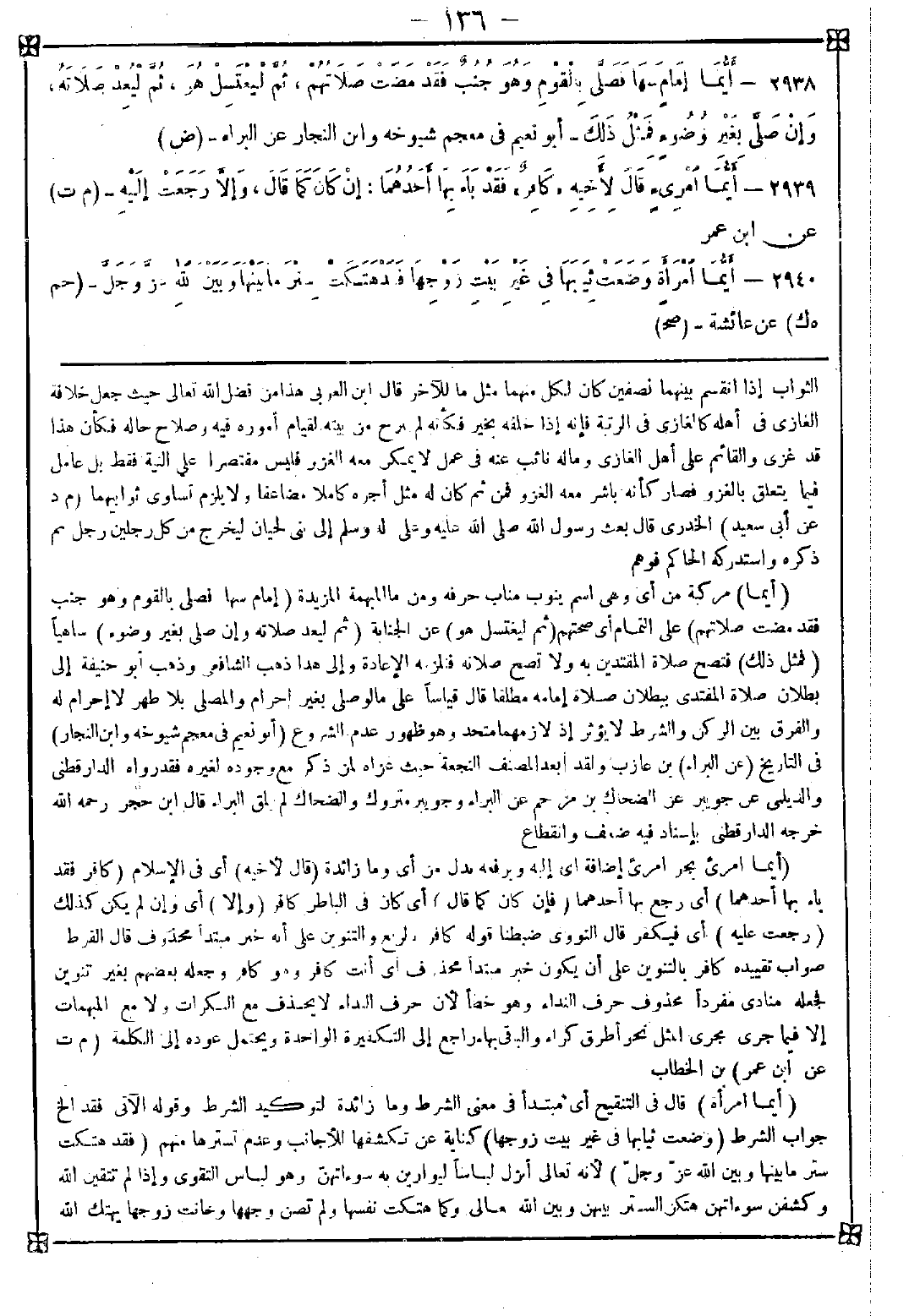2938 - (أيما) مركبة من أي وهي اسم ينوب مناب حرفه ومن ما المبهمة المزيدة (إمام سها فصلى بالقوم وهو جنب فقد مضت صلاتهم) على التمام أي صحتهم (ثم ليغتسل هو) عن الجنابة (ثم ليعد صلاته وإن صلى بغير وضوء) ساهيا (فمثل ذلك) فتصح صلاة المقتدين به ولا تصح صلاته فيلزمه الإعادة إلى هذا ذهب الشافعي وذهب أبو حنيفة إلى بطلان صلاة المقتدي ببطلان صلاة إمامه مطلقا قال قياسا على ما لو صلى بغير إحرام والمصلي بلا طهر لا إحرام له والفرق بين الركن والشرط لا يؤثر إذ لازمهما متحد وهو ظهور عدم الشروع. (1)