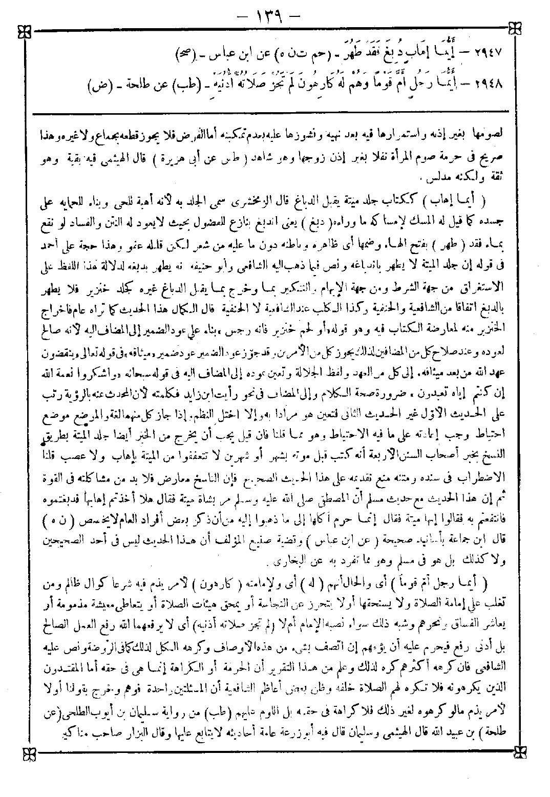 2947 - (أيما إهاب) ككتاب جلد ميتة يقبل الدباغ قال الزمخشري: سمي الجلد به لأنه أهبة للحي وبناء للحماية على جسده كما قيل له المسك لإمساكه ما وراءه (دبغ) يعني اندبغ بنازع للعضول بحيث لا يعود له النتن والفساد لو نقع بماء (فقد طهر) بفتح الهاء وضمها أي ظاهره وباطنه دون ما عليه من شعر لكن قليله عفو وهذا حجة على أحمد في قوله إن جلد الميتة لا يطهر باندباغه ونص فيما ذهب إليه الشافعي وأبو حنيفة أنه يطهر بدبغه لدلالة هذا اللفظ على الاستغراق من جهة الشرط ومن جهة الإبهام والتنكير بما وخرج بما يقبل الدباغ غيره كجلد خنزير فلا يطهر بالدبغ اتفاقا من الشافعية والحنفية وكذا الكلب عند الشافعية لا الحنفية قال الكمال: هذا الحديث كما تراه عام فإخراج الخنزير منه لمعارضة الكتاب فيه وهو قوله {أو لحم خنزير فإنه رجس} بناء على عود الضمير إلى المضاف إليه لأنه صالح لعوده وعند صلاح كل من المضافين لذلك يجوز كل من الأمرين وقد جوز عود الضمير عود ضمير " ميثاقه " في قوله تعالى {وينقضون عهد الله من بعد ميثاقه} إلى كل من العهد ولفظ الجلالة وتعين عوده إلى المضاف إليه في قوله سبحانه {واشكروا نعمة الله إن كنتم إياه تعبدون} ضرورة صحة الكلام وإلى المضاف في نحو رأيت ابن زايد فكلمته لأن المحدث عنه بالرؤية رتب على الحديث الأول غير الحديث الثاني فتعين هو مرادا به وإلا اختل النظم وإذا جاز كل منهما لغة والموضع موضع احتياط وجب إعادته على ما فيه الاحتياط وهو مما قلنا فإن قيل يجب أن يخرج من الخبر أيضا جلد الميتة بطريق النسخ بخبر أصحاب السنن الأربعة أنه كتب قبل موته بشهر أو شهرين لا تتعففوا من الميتة بإهاب ولا عصب قلنا الاضطراب في سنده ومتنه منع تقديمه على هذا الحديث الصحيح فإن الناسخ معارض فلا بد من مشاكلته في القوة ثم إن هذا الحديث مع حديث مسلم أن المصطفى صلى الله عليه وسلم مر بشاة ميتة فقال: هلا أخذتم إهابها فدبغتموه فانتفعتم به فقالوا: إنها ميتة فقال: إنما حرم أكلها إلى ما ذهبوا إليه من أن ذكر بعض أفراد العام لا يخصص