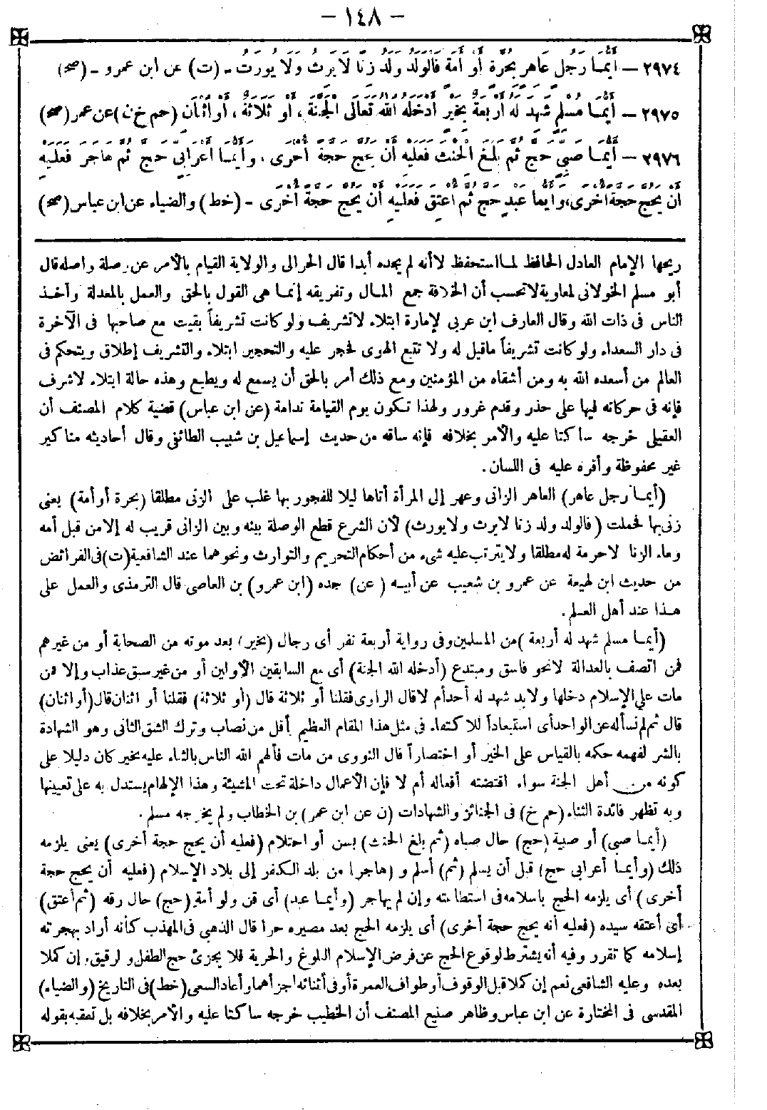 2974 - (أيما رجل عاهر) العاهر الزاني وعهر إلى المرأة أتاها ليلا للفجور بها غلب على الزنى مطلقا (بحرة أو أمة) يعني زنى بها فحملت (فالولد ولد زنا لا يرث ولا يورث) لأن الشرع قطع الوصلة بينه وبين الزاني قريب له إلا من قبل أمه وماء الزنا لا حرمة له مطلقا ولا يترتب عليه شيء من أحكام التحريم والتوارث ونحوهما عند الشافعية