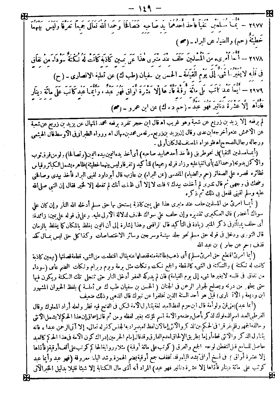 2979 - (أيما عبد) يعني قن ولو أمة قال ابن حزم: لفظ العبد لغة يتناول الأمة لكن في الفتح فيه نظر ولعله أراد المملوك وقال القرطبي: العبد اسم للملوك الذكر بأصل وضعه والأمة اسم لمؤنثه بغير لفظه ومن ثم قال إسحاق: إن هذا الحكم لا يشمل الأنثى وخالفه الجمهور فلم يفرقوا في الحكم بين الذكر والأنثى إما لأن لفظ العبد يراد به الجنس كقوله تعالى {إلا آتي الرحمن عبدا} فإنه يتناول الذكر والأنثى قطعا وإما بطريق الإلحاق لعدم الفارق وقد قال إمام الحرمين: إدراك كون الأمة في هذا الحكم كالعبد حاصل للسامع قبل التفطن لوجه الجمع والفرق (كوتب على مئة اوقية) مثلا ورواية الحاكم كوتب على ألف أوقية (فأداها إلا عشرة أواق) في نسخ أواقي بشد الياء وقد تخفف جمع أوقية بضم الهمزة وشد الياء معروفة (فهو عبد وأيما عبد كوتب على مئة دينار فأداها إلا عشرة دنانير فهو عبد) المراد أنه أدى مال الكتابة إلا شيئا قليلا بدليل الخبر الآتي -[150]- المكاتب عبد ما بقي عليه درهم فلا يعتق إلا بأداء جميع ما عدا القدر الذي يجب حطه عنه وهذا مذهب الجمهور ونقل عن علي كرم الله وجهه أنه يعتق عنه بقدر ما أدى والمكاتب بالفتح من تقع له الكتابة وبالكسر من تقع منه وكاف الكتابة تكسر وتفتح كعين العتاقة قال الراغب: اشتقاقها من كتب بمعنى أوجب ومنه {كتب عليكم الصيام} أو جمع وضم ومنه كتب الخط وعلى الأول مأخذها من الالتزام وعلى الثاني من الخط لوجوده عند عقدها غالبا. قال الروياني: وهي إسلامية ونوزع بأنها كانت متعارفة في الجاهلية وأقرها الشارع وأحسن تعاريفها أنها تعليق عتق بصفة على معاوضة مخصوصة