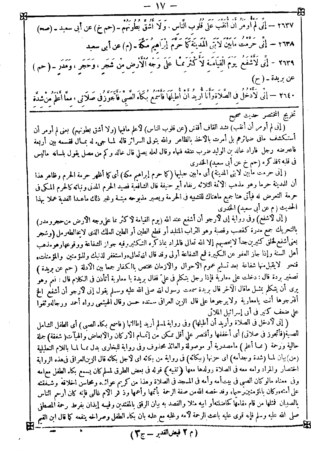 2638 - (إني حرمت ما بين لابتي المدينة) أي ما بين جبليها (كما حرم إبراهيم مكة) أي كما أظهر حرمة الحرم وظاهر هذا أن للمدينة حرما وهو مذهب الأئمة الثلاثة ونفاه أبو حنيفة قال الشافعية: فصيد الحرم المدني ونباته كالحرم المكي في حرمة التعرض له فيأتي هنا جميع ما هناك للتشبيه في الحرمة ويصير مذبوحه ميتة وغير ذلك ما عدا الفدية عملا بهذا الحديث