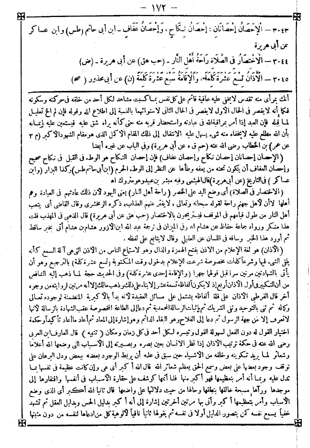 3045 - (الأذان) هو لغة الإعلام من الأذن بفتح الهمزة والذال وهو لاستماع الناس من الأذن التي هي آلة السمع كأنه يلقي الشيء فيها وشرعا كلمات مخصوصة شرعت للإعلام بدخول وقت المكتوبة (تسع عشرة كلمة) بالترجيع وهو أن يأتي بالشهادتين مرتين سرا قبل قولهما جهرا (والإقامة إحدى عشرة كلمة) وفي الحديث حجة لما ذهب إليه الشافعي من أن التكبير في أول الأذان أربع إذ لا يكون ألفاظه تسعة عشر إلا بناء على ذلك وذهب مالك إلى أنه مرتين لروايته من وجوه أخر قال القرطبي: الأذان على قلة ألفاظه يشتمل على مسائل العقيدة لأنه بدأ بالأكبرية المتضمنة لوجوده تعالى وكماله ثم ثنى بالتوحيد ونفى الشريك ثم بإثبات الرسالة المحمدية ثم دعا إلى الطاعة المخصوصة عقب الشهادة بالرسالة لأنها لا تعرف إلا من جهة الرسول ثم دعا إلى الفلاح وهو البقاء الدائم وهو إشارة إلى المعاد ثم أعاد ما أعاد تأكيدا وحكمة اختيار القول له دون الفعل لسهولة القول وتيسره لكل أحد في كل زمان ومكان <تنبيه> قال العارف ابن العربي رضي الله عنه في حكمة ترتيب الأذان إذا نظر الإنسان بعين بصره وبصيرته إلى الأسباب التي وضعها الله أعلاما وشعائر لما يريد تكوينه وخلقه من الأشياء حين سبق في علمه أن يربط الوجود بعضه ببعض ودل البرهان على توقف وجود بعضها على بعض وسمع الحق يعظم شعائر الله قال الله أكبر أي هي وإن كانت عظيمة في نفسها بما تدل عليه وبما أنه أمر بتعظيمها فهو أكبر منها فلما أتمها كوشف على حقارة الأسباب في أنفسها وافتقارها إلى موجدها ورآها مسبحة خالقها بنطقها وحالها من حيث دلالتها على واضعها قال ثانيا الله أكبر أي الذي وضع الأسباب وأمر بتعظيمها أكبر وأتى بها مرتين أخرتين إشارة إلى أنه أكبر بدليل الحس وبدليل العقل ثم تشهد خفيا يسمع نفسه كمن يتصور الدليل أولا في نفسه ثم يقولها ثانيا نافيا لألوهية كل من ادعاها لنفسه من دون مثبتها -[173]- لمستحقها عقلا وشرعا هذا كله مع نفسه ثم يرفع بها صوته فيسمع غيره من متعلم ومدع وجاهل وغافل ثم لما شهد بالتوحيد بما أعطاه الدليل مشهد به علما وقربة بالنداء على أن الرسول جاء به من عند الله ثم شرع بعد الشهادتين الحيعلتين ليدعو بالواحدة نفسه وبالأخرى غيره فيقول للخارج والكائن في المسجد ولنفسه ولغيره أقبلوا على ما ينجيكم من عذابه بنعيمه ومن حجابه بتجليه ثم يقول الله أكبر الله أكبر لنفسه ولغيره ولمن ينتظر الصلاة بالمسجد ولمن هو خارجه في أشغاله أي الله أولى بالتكبير من الذي منعكم من الإقبال على الصلاة وإنما لم يرفع الحيعلتين والتكبير الثاني لأن القصد به القربة والعقل لا يستقل بإدراكها فهي للشرع وثنى لكونه خاطب نفسه وغيره ثم ختمه بالتوحيد المطلق لما تضمن الأذان أفعالا منسوبة للعبد فربما وقع في نفس المدعو أو الداعي إلى فعلها فخيف عليه أن يضيف الفعل إلى نفسه خلقا كما يراه بعضهم فختم بالتوحيد إشارة إلى تفرده بالخلق وإنما قال في الإقامة قد قامت بلفظ الماضي والصلاة مستقلة إشارة إلى أن من كان منتظرا للصلاة أو آتيا إليها أو مشتغلا ببعض شروطها فمات قبل إدراكها فقد قامت له الصلاة فجاء بلفظ الماضي لتحقق الحصول فإذا حصلت بالفعل فله أجر الحصول بالفعل وإقامة الصلاة تمام نشأتها وكمالها أي هي لكم قائمة النشأة كاملة الهيئة على حسب ما شرعت فإذا دخلتم فيها وأجرتم الأجر الثاني فقد يكون كالأول في إقامة نشأتها وقولا كمن يأتي بها خداجا من حيث فعلها