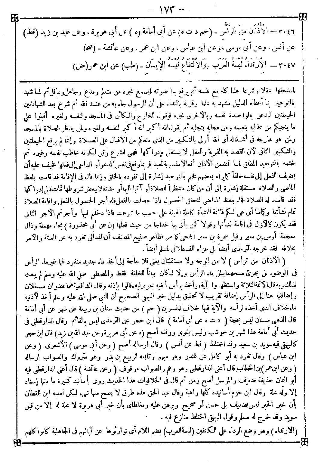 3046 - (الأذنان من الرأس) لا من الوجه ولا مستقلتان يعني فلا حاجة إلى أخذ ماء جديد منفرد لهما غير ماء الرأس في الوضوء بل يجزئ مسحهما ببلل ماء الرأس وإلا لكان بيانا للخلقة فقط والمصطفى صلى الله عليه وسلم لم يبعث لذلك ربه قال الأئمة الثلاثة واستظهروا بآية {وأخذ برأس أخيه يجره إليه} قالوا بإذنه وقال الشافعية هما عضوان مستقلان وإضاقتها هنا إلى الرأس إضافة تقريب لا تحقيق بدليل خبر البيهقي الصحيح أن النبي صلى الله عليه وسلم أخذ لأذنيه ماء خلاف الذي أخذه لرأسه والآية فيها خلاف للمفسرين