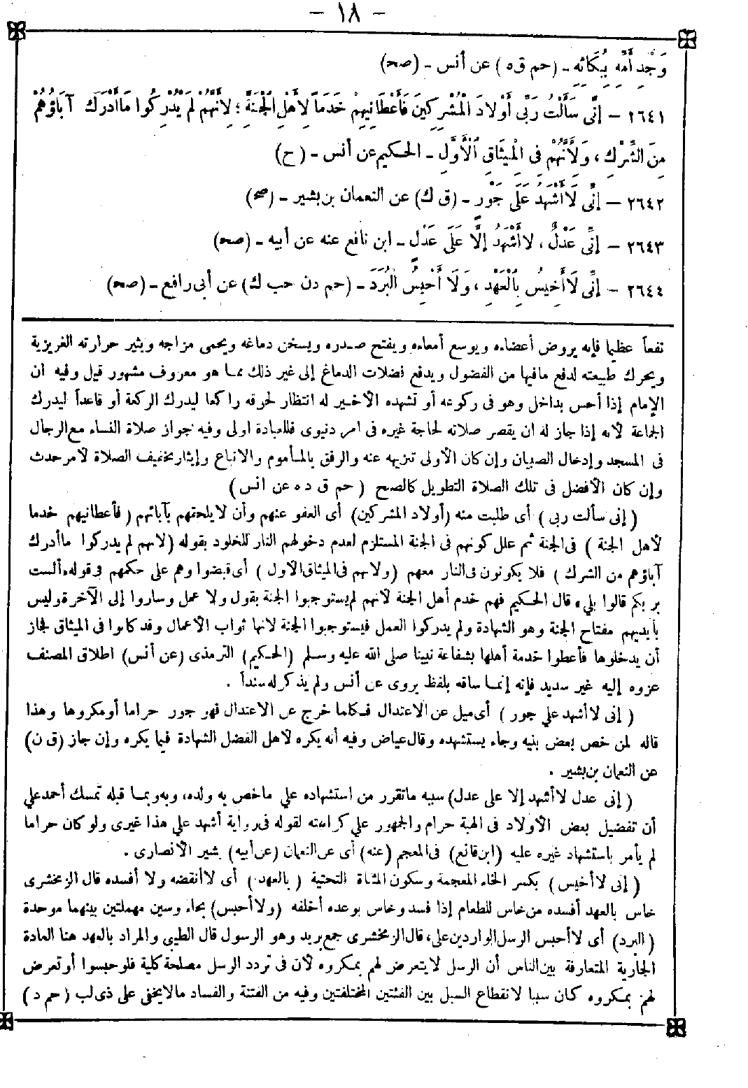 2643 - (إني عدل لا أشهد إلا على عدل) سببه ما تقرر من استشهاده على ما خص به ولده وبه وبما قبله تمسك أحمد على أن تفضيل بعض الأولاد في الهبة حرام والجمهور على كراهيته لقوله في رواية: أشهد على هذا غيري ولو كان حراما لم يأمر باستشهاد غيره عليه