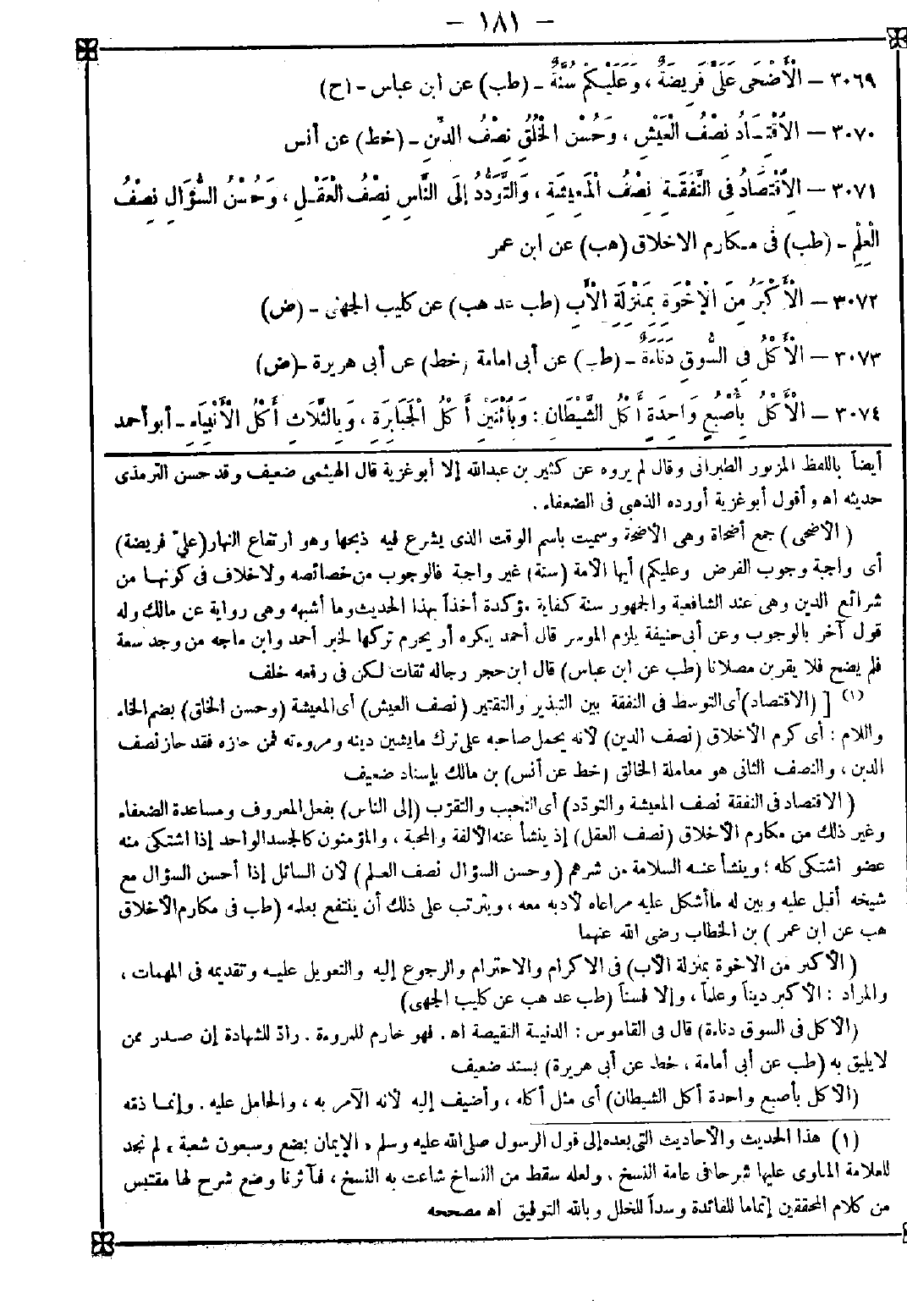 (1) [وفي أيامنا يحمل هذا الحديث على الأكل في السوق ماشيا أو واقفا. أما الأكل في الأماكن المعدة للأكل فلا يتناولها هذا النهي وإن كانت قد توجد قريبا من الأسواق خصوصا لأصحاب الحرف والأعمال. وبعض أسباب كراهة الأكل في السوق تظهر بعد التأمل في الأحاديث الأخرى التالية: