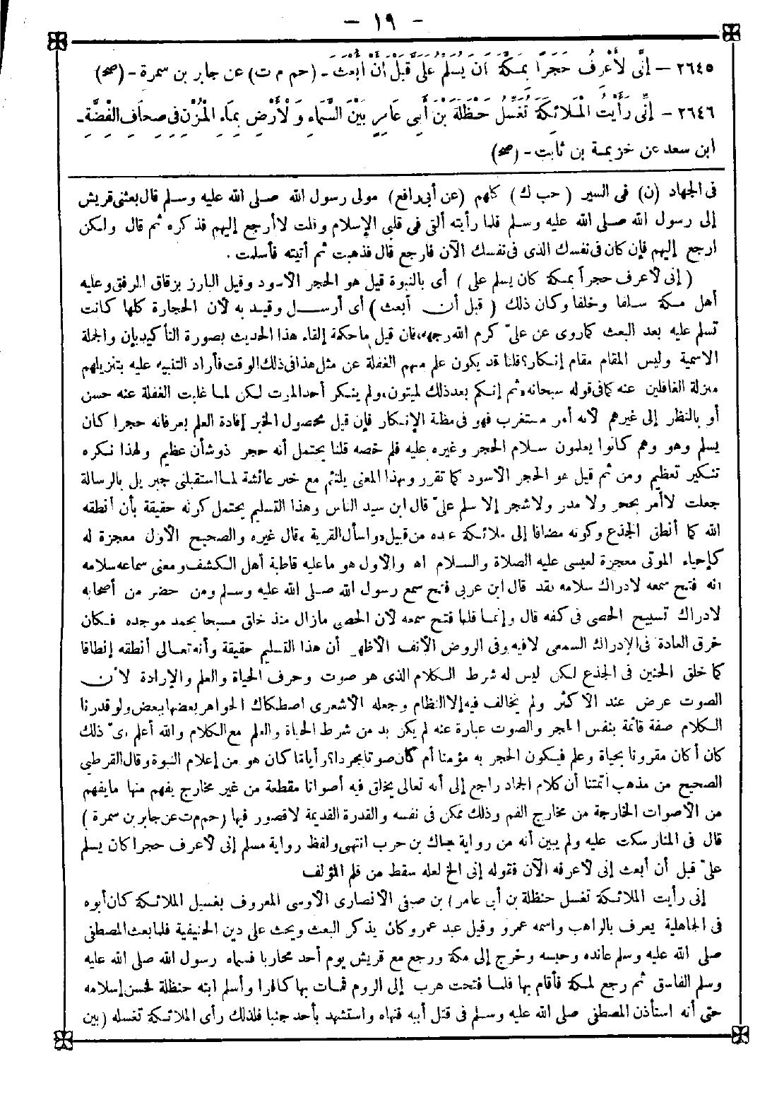 2645 - (إني لأعرف حجرا بمكة كان يسلم علي) أي بالنبوة قيل هو الحجر الأسود وقيل البارز بزقاق المرفق وعليه أهل مكة سلفا وخلفا وكان ذلك (قبل أن أبعث) أي أرسل وقيد به لأن الحجارة كلها كانت تسلم عليه بعد البعث كما روي عن علي كرم الله وجهه فإن قيل: ما حكمة إلقاء هذا الحديث بصورة التأكيد بإن والجملة الاسمية وليس المقام مقام إنكار؟ قلنا: قد يكون علم منهم الغفلة عن مثل هذا في ذلك الوقت فأراد التنبيه عليه بتنزيلهم منزلة الغافلين عنه كما في قوله سبحانه {ثم إنكم بعد ذلك لميتون} ولم ينكر أحد الموت لكن لما غلبت الغفلة عنه حسن أو بالنظر إلى غيرهم لأنه أمر مستغرب فهو في مظنة الإنكار فإن قيل: محصول الخبر إفادة العلم بعرفانه حجرا كان يسلم وهو وهم كانوا يعلمون سلام الحجر وغيره عليه فلم خصه قلنا: يحتمل أنه حجر ذو شأن عظيم ولهذا نكره تنكير تعظيم ومن ثم قيل هو الحجر الأسود كما تقرر وبهذا المعنى يلتئم مع خبر عائشة لما استقبلني جبريل بالرسالة جعلت لا أمر بحجر ولا مدر ولا شجر إلا سلم علي قال ابن سيد البأس: وهذا التسليم يحتمل كونه حقيقة بأن أنطقه الله كما أنطق الجذع وكونه مضافا إلى ملائكة عنده من قبيل {واسأل القرية} قال غيره: والصحيح الأول معجزة له كإحياء الموتى معجزة لعيسى عليه الصلاة والسلام اه والأول هو ما عليه قاطبة أهل الكشف ومعنى سماعه سلامه أنه فتح سمعه لإدراك سلامه فقد قال ابن عربي: فتح سمع رسول الله صلى الله عليه وسلم ومن حضر من أصحابه لإدراك تسبيح الحصى في كفه قال: وإنما قل فتح سمعه لأن الحصى ما زال منذ خلق مسبحا بحمد موجده فكان خرق العادة في الإدراك السمعي لا فيه وفي الروض الأنف الأظهر أن هذا التسليم حقيقة وأنه تعالى أنطقه إنطاقا كما خلق الحنين في الجذع لكن ليس له شرط الكلام الذي هو صوت وحرف الحياة والعلم والإرادة لأن الصوت عرض عند الأكثر ولم يخالف فيه إلا النظام وجعله الأشعري اصطكاك الجواهر بعضها ببعض ولو قدرنا الكلام صفة قائمة بنفس الحجر والصوت عبارة عنه لم يكن بد من شرط الحياة والعلم مع الكلام والله أعلم أي ذلك كان أكان مقرونا بحياة وعلم فيكون الحجر به مؤمنا أم كان صوتا مجردا؟ وأيا ما كان هو من إعلام النبوة وقال القرطبي: الصحيح من مذهب أئمتنا أن كلام الجماد راجع إلى أنه تعالى يخلق فيه أصواتا مقطعة من غير مخارج يفهم منها ما يفهم من الأصوات الخارجة من مخارج الفم وذلك ممكن في نفسه والقدرة القديمة لا قصور فيها