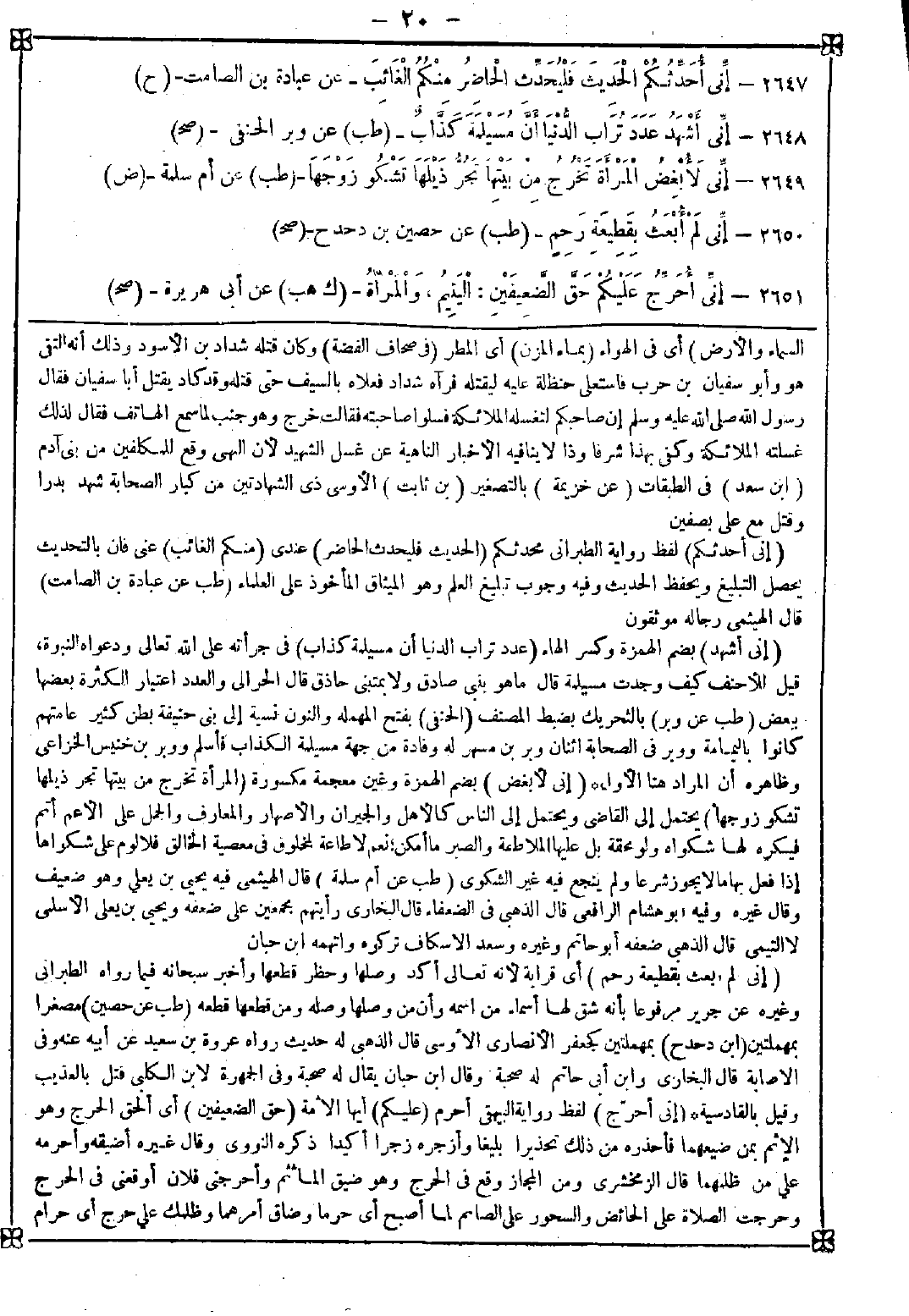 2651 - (إني أحرج) لفظ رواية البيهقي أحرم (عليكم) أيها الأمة (حق الضعيفين) أي ألحق الحرج وهو الإثم بمن ضيعهما فأحذره من ذلك تحذيرا بليغا وأزجره زجرا أكيدا ذكره النووي وقال غيره: أضيقه وأحرمه على من ظلمهما قال الزمخشري: ومن المجاز وقع في الحرج وهو ضيق المأثم وأحرجني فلان أوقعني في الحرج وحرجت الصلاة على الحائض والسحور على الصائم لما أصبح أي حرما وضاق أمرهما وظلمك على حرج أي حرام -[21]- ضيق وتحرج فلان من كذا أي تأثم وحلف بالمحرجات أي بالطلاق الثلاث (اليتيم والمرأة) وجه تسميتهما بالضعيفين ظاهرة بل محسوسة وقد مر ذلك مبسوطا فراجعه