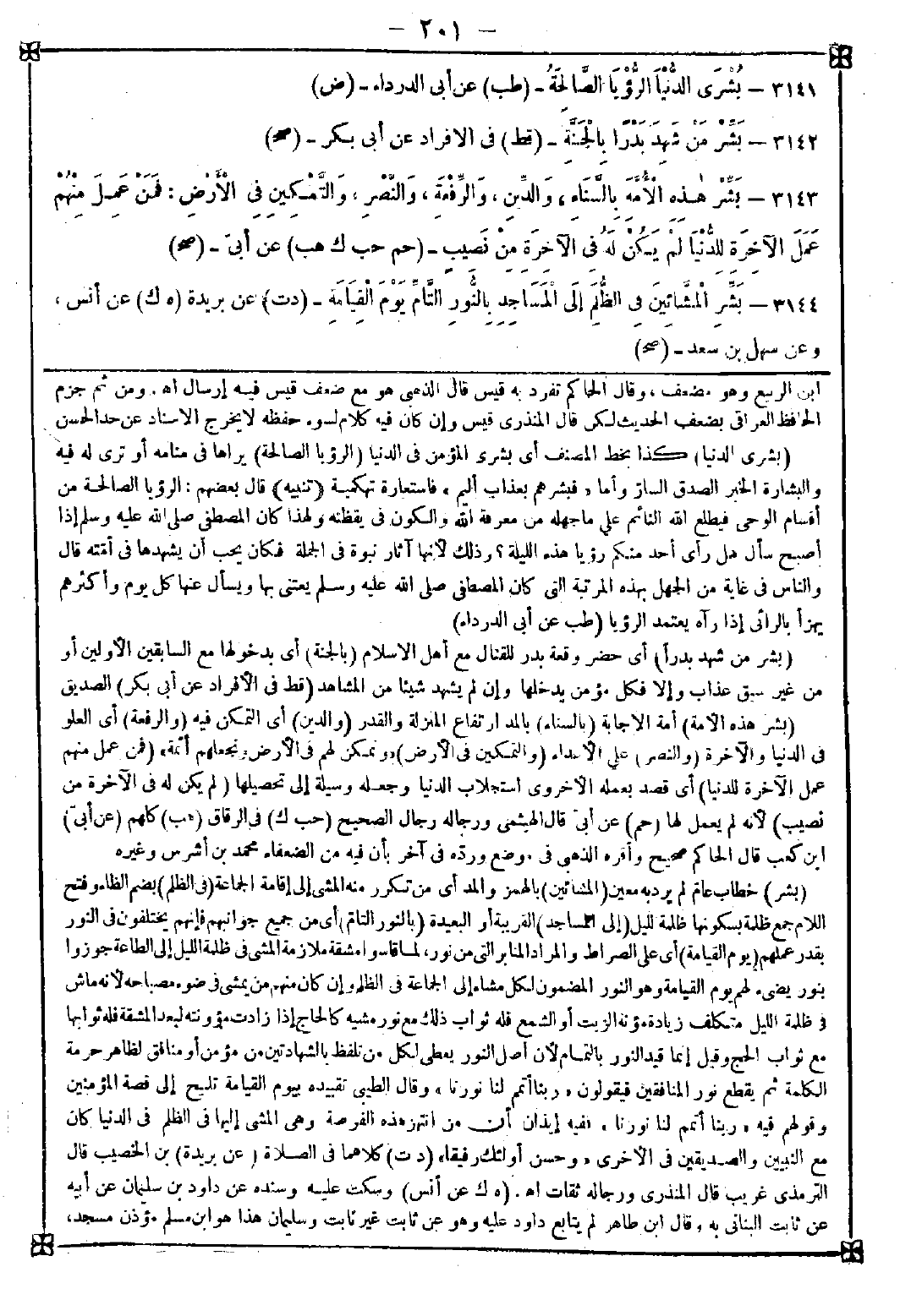 3143 - (بشر هذه الأمة) أمة الإجابة (بالسناء) بالمد ارتفاع المنزلة والقدر (والدين) أي التمكن فيه (والرفعة) أي العلو في الدنيا والآخرة (والنصر) على الأعداء (والتمكين في الأرض) {ونمكن لهم في الأرض ونجعلهم أئمة} (فمن عمل منهم عمل الآخرة للدنيا) أي قصد بعمله الأخروي استجلاب الدنيا وجعله وسيلة إلى تحصيلها (لم يكن له في الآخرة من نصيب) لأنه لم يعمل لها