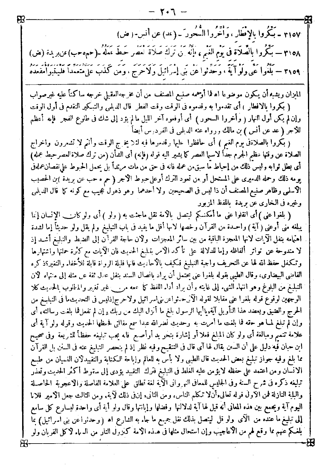 3159 - (بلغوا عني) أي انقلوا عني ما أمكنكم ليتصل بالأمة نقل ما جئت به (ولو) أي ولو كان الإنسان إنما يبلغه مني أو عني (آية) واحدة من القرآن وخصها لأنها أقل ما يفيد في باب التبليغ ولم يقل ولو حديثا إما لشدة اهتمامه بنقل الآيات لأنها المعجزة الباقية من بين سائر المعجزات ولأن حاجة القرآن إلى الضبط والتبليغ أشد إذ لا مندوحة عن تواتر ألفاظه وإما للدلالة على تأكد الأمر بتبليغ الحديث فإن الآيات مع كثرة حملتها واشتهارها وتكفل حفظ الله لها عن التحريف واجبة التبليغ فكيف بالأحاديث فإنها قليلة الرواة قابلة للإخفاء والتغير؟ ذكره القاضي البيضاوي وقال الطيبي: بقوله بلغوا عني يحتمل أن يراد باتصال السند بنقل عدل ثقة عن مثله إلى منتهاه لأن التبليغ من البلوغ وهو انتهاء الشيء إلى غايته وأن يراد أداء اللفظ كما سمعه من غير تغيير والمطلوب بالحديث كلا الوجهين لوقوع قوله بلغوا عني مقابلا لقوله الآن حدثوا عن بني إسرائيل ولا حرج إذ ليس في التحديث ما في التبليغ من الحرج والضيق ويعضد هذا التأويل آية {يا أيها الرسول بلغ ما أنزل إليك من ربك وإن لم تفعل فما بلغت رسالته} أي وإن لم تبلغ لما هو حقه فما بلغت ما أمرت به وحديث نضر الله عبدا سمع مقالتي فحفظها الحديث وقوله ولو آية أي علامة تتميم ومبالغة أي ولو كان المبلغ فعلا أو إشارة بنحو يد أو أصبع فإنه يجب تبليغه حفظا للشريعة وفي صحيح ابن حبان فيه دليل على أن السنن يقال لها آي قال في التنقيح: وفيه نظر إذ لم ينحصر التبليغ عنه في السنن بل القرآن مما بلغ وفيه جواز تبليغ بعض الحديث قال الطيبي: ولا بأس به للعالم وإباحة الكتابة والتقييد لأن النسيان من طبع الإنسان ومن اعتمد على حفظه لا يؤمن عليه الغلط في التبليغ فترك التقييد يؤدي إلى سقوط أكثر الحديث وتعذر تبليغه ذكره في شرح السنة وفي الجليس للمعافى النهرواني الآية لغة تطلق على العلامة الفاصلة والأعجوبة الحاصلة والبلية النازلة فمن الأول قوله تعالى {أن لا تكلم الناس} ومن الثاني {إن في ذلك لآية} ومن الثالث جعل الأمير فلانا اليوم آية ويجمع بين هذه المعاني أنه قيل لها آية لدلالتها وفضلها وإبانتها وقال ولو آية أي واحدة ليسارع كل سامع إلى تبليغ ما عنده من الآي ولو قل ليتصل بذلك نقل جميع ما جاء به الشارع اه. (وحدثوا عن بني إسرائيل) بما بلغكم عنهم مما وقع لهم من الأعاجيب وإن استحال مثلها في هذه الأمة كنزول النار من السماء لأكل القربان ولو -[207]- كان بلا سند لتعذر الاتصال في التحديث عنهم لبعد الزمان بخلاف الأحكام المحمدية (ولا حرج) لا ضيق عليكم في التحديث به إلا أن يعلم أنه كذب أو لا حرج أن لا تحدثوا وعليه فزاده دفعا لتوهم وجوب التحديث من صورة صدور الأمر به قال الطيبي: ولا منافاة بين إذنه هنا ونهيه في خبر آخر عن التحديث وفي آخر عن النظر في كتبهم لأنه أراد هنا التحديث بقصصهم نحو قتل أنفسهم لتوبتهم وبالنهي العمل بالأحكام لنسخها بشرعه أو النهي في صدر الإسلام قبل استقرار الأحكام الدينية والقواعد الإسلامية فلما استقرت أذن لأمن المحذور (ومن كذب علي متعمدا) يعني ومن لم يبلغ حق التبليغ ولم يحفظ في الأداء ولم يراع صحة الإسناد (فليتبوأ) بسكون اللام فليتخذ (مقعده من النار) أي فليدخل في زمرة الكاذبين نار جهنم والأمر بالتبوئ تهكم كما مر وقد استفدنا وجوب تبليغ العلم على حامليه وهو الميثاق الذي أخذه الله على العلماء قال البغوي: ولهذا الحديث كره قوم من الصحب والتابعين إكثار الحديث عن المصطفى صلى الله عليه وسلم خوفا من الزيادة والنقصان والغلط حتى أن من التابعين من كان يهاب رفع المرفوع فيقفه على الصحابي