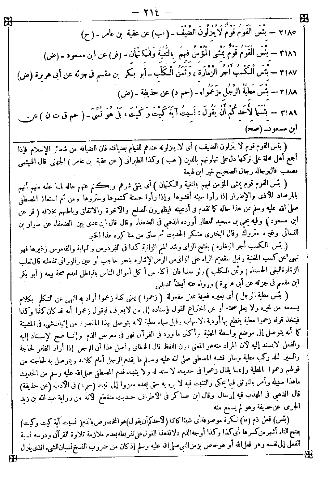 3187 - (بئس الكسب أجر الزمارة) بفتح الزاي وشد الميم الزانية كذا في الفردوس والنهاية والقاموس وغيرها فهو نهي عن كسب المغنية وقيل بتقديم الراء على الزاي من الرمز الإشارة بنحو حاجب أو عين والزواني تفعلنه قال ثعلب: الزمارة البغي الحسناء (وثمن الكلب) ولو معلما فإن أكله من أكل أموال الناس بالباطل لعدم صحة بيعه