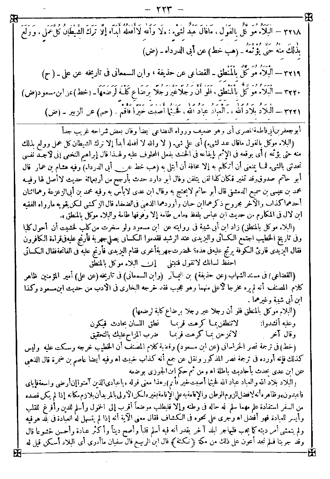 3219 - (البلاء موكل بالمنطق) زاد ابن أبي شيبة في روايته عن ابن مسعود ولو سخرت من كلب لخشيت أن أحول كلبا وفي تاريخ الخطيب: اجتمع الكسائي واليزيدي عند الرشيد فقدموا الكسائي يصلي جهرية فأرتج عليه في قراءة الكافرون فقال اليزيدي: قارئ الكوفة يرتج عليه في هذه؟ فحضرت جهرية أخرى فقام اليزيدي فأرتج عليه في الفاتحة فقال الكسائي: