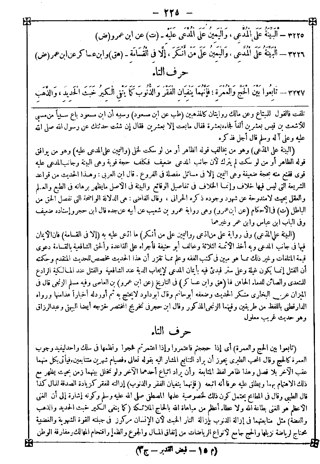 3225 - (البينة على المدعي) وهو من يخالف قوله الظاهر أو من لو سكت لخلى (واليمين على المدعى عليه) وهو من يوافق قوله الظاهر أو من لو سكت لم يترك لأن جانب المدعي ضعيف فكلف حجة قوية وهي البينة وجانب المدعى عليه قوي فقنع منه بحجة ضعيفة وهي اليمين إلا في مسائل مفصلة في الفروع. قال ابن العربي: وهذا الحديث من قواعد الشريعة التي ليس فيها خلاف وإنما الخلاف في تفاصيل الوقائع والبينة في الأصل ما يظهر برهانه في الطبع والعلم والعقل بحيث لا مندوحة عن شهود وجوده ذكره الحرالي وقال القاضي: هي الدلالة الواضحة التي تفصل الحق من الباطل