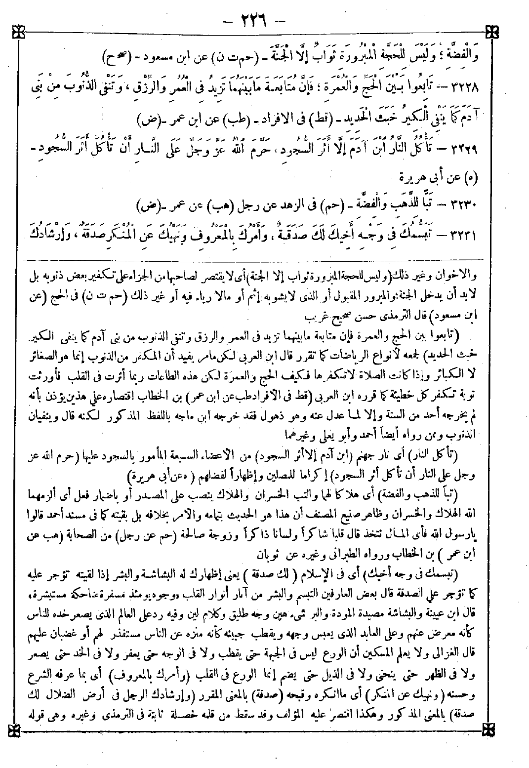 3228 - (تابعوا بين الحج والعمرة فإن متابعة ما بينهما تزيد في العمر والرزق وتنفي الذنوب من بني آدم كما ينفي الكير خبث الحديد) لجمعه لأنواع الرياضات كما تقرر قال ابن العربي: لكن ما مر يفيد أن المكفر من الذنوب إنما هو الصغائر لا الكبائر وإذا كانت الصلاة لا تكفرها فكيف الحج والعمرة لكن هذه الطاعات ربما أثرت في القلب فأورثت توبة تكفر كل خطيئة كما قرره ابن العربي