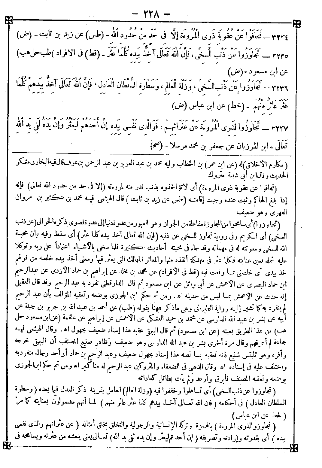 3234 - (تجافوا عن عقوبة ذوي المروءة) أي لا تؤاخذوه بذنب ندر منه لمروءته (إلا في حد من حدود الله تعالى) فإنه إذا بلغ الحاكم وثبت عنده وجبت إقامته