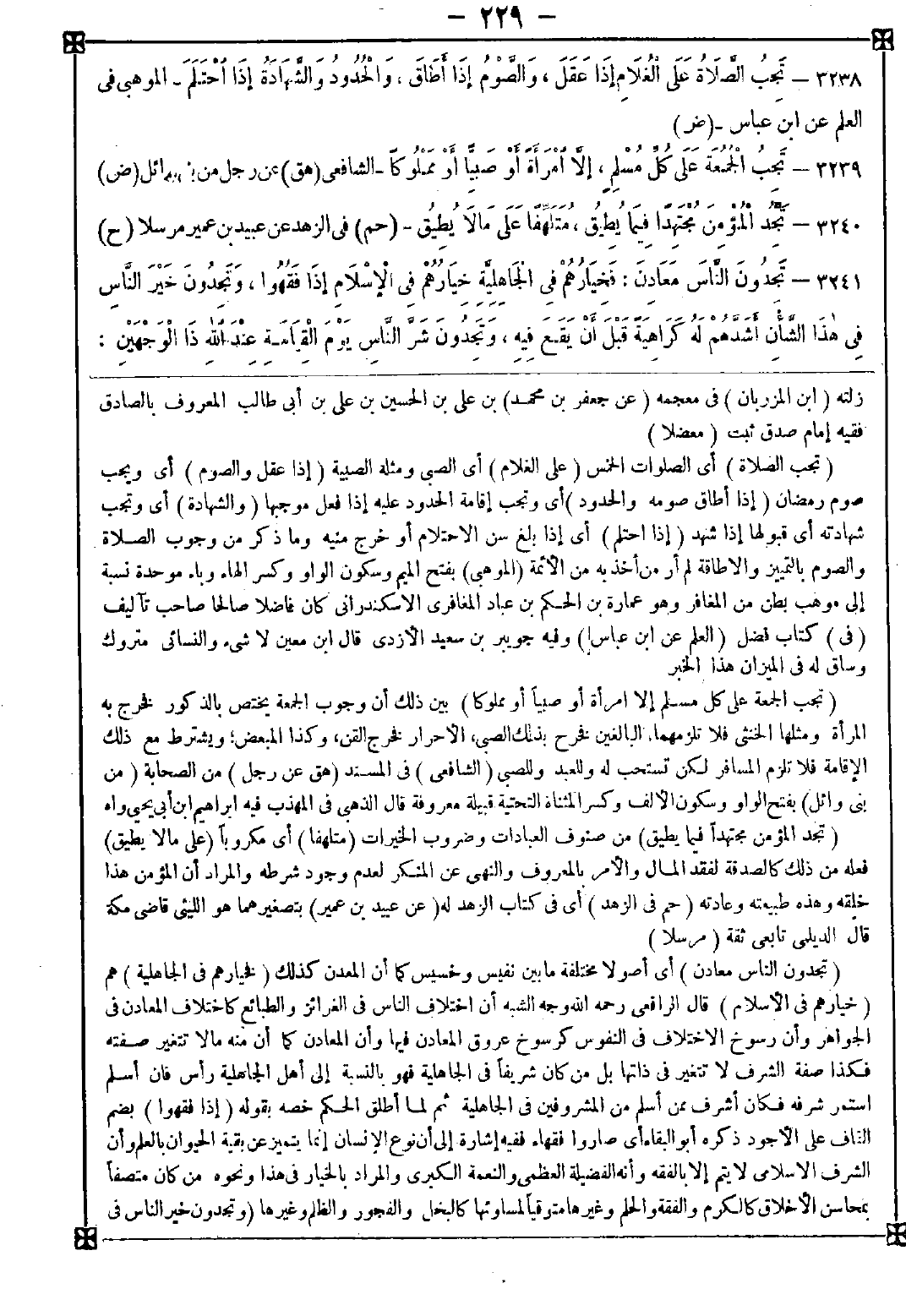 3238 - (تجب الصلاة) أي الصلوات الخمس (على الغلام) أي الصبي ومثله الصبية (إذا عقل والصوم) أي ويجب صوم رمضان (إذا أطاق صومه والحدود) أي وتجب إقامة الحدود عليه إذا فعل موجبها (والشهادة) أي وتجب شهادته أي قبولها إذا شهد (إذا احتلم) أي إذا بلغ سن الاحتلام أو خرج منيه وما ذكر من وجوب الصلاة والصوم بالتمييز والإطاقة لم أر من أخذ به من الأئمة