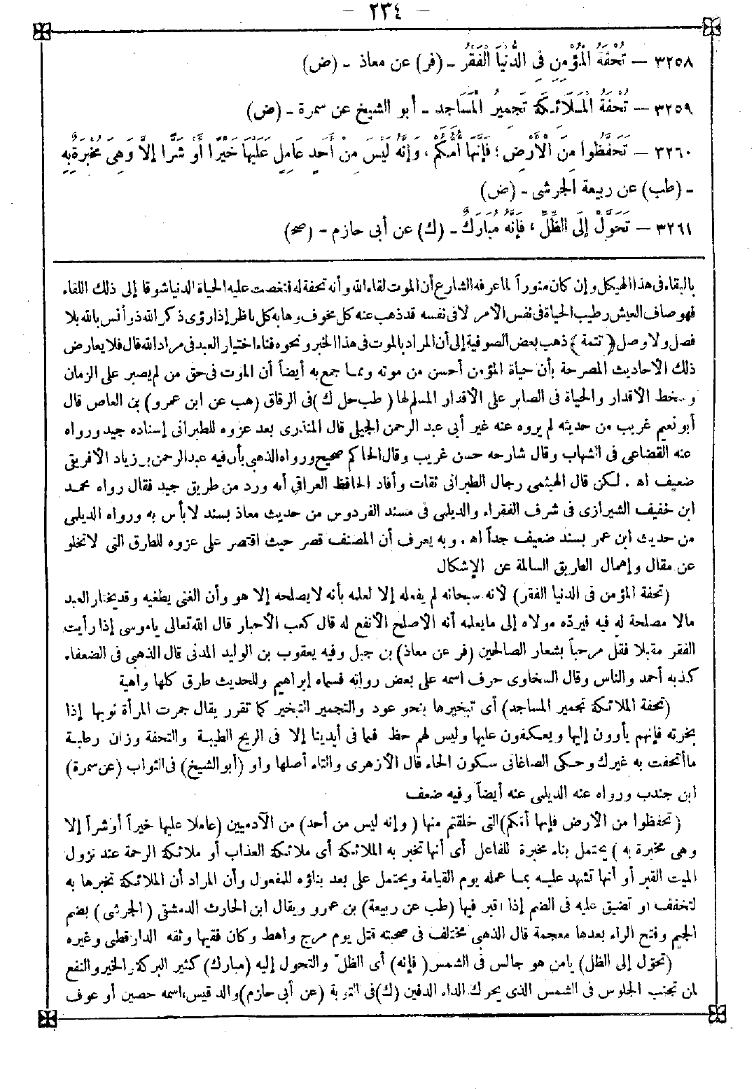 3259 - (تحفة الملائكة تجمير المساجد) أي تبخيرها بنحو عود والتجمير التبخير كما تقرر يقال جمرت المرأة ثوبها إذا بخرته فإنهم يأوون إليها ويعكفون عليها وليس لهم حظ فيما في أيدينا إلا في الريح الطيبة والتحفة وزان رطبة ما أتحفت به غيرك وحكى الصاغاني سكون الحاء قال الأزهري: والتاء أصلها واو