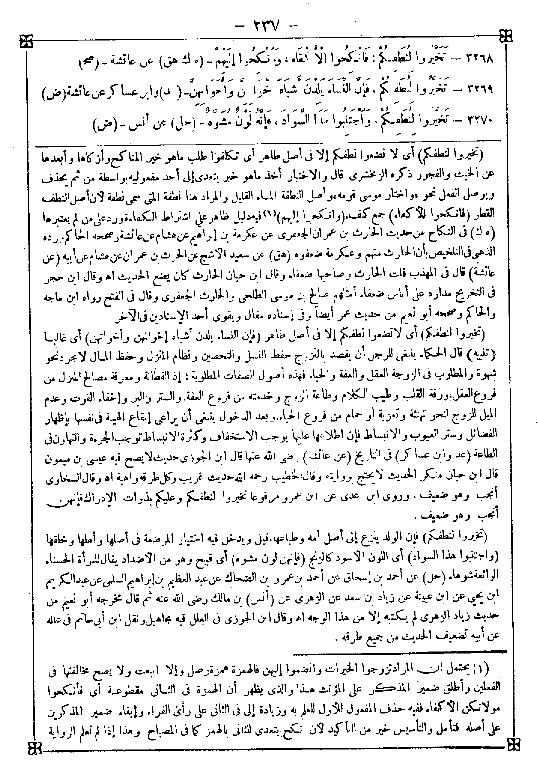 -[237]- 3268 - (تخيروا لنطفكم) أي لا تضعوا نطفكم إلا في أصل طاهر أي تكلفوا طلب ما هو خير المناكح وأزكاها وأبعدها عن الخبث والفجور ذكره الزمخشري قال: والاختيار أخذ ما هو خبر يتعدى إلى أحد مفعوليه بواسطة من ثم يحذف ويوصل الفعل نحو {واختار موسى قومه} وأصل النطفة الماء القليل والمراد هنا نطفة المني سمي نطفة لأن أصل النطف القطر (فانكحوا الأكفاء) جمع كفء (وأنكحوا إليهم) (1) فيه دليل ظاهر على اشتراط الكفاءة ورد على من لم يعتبرها