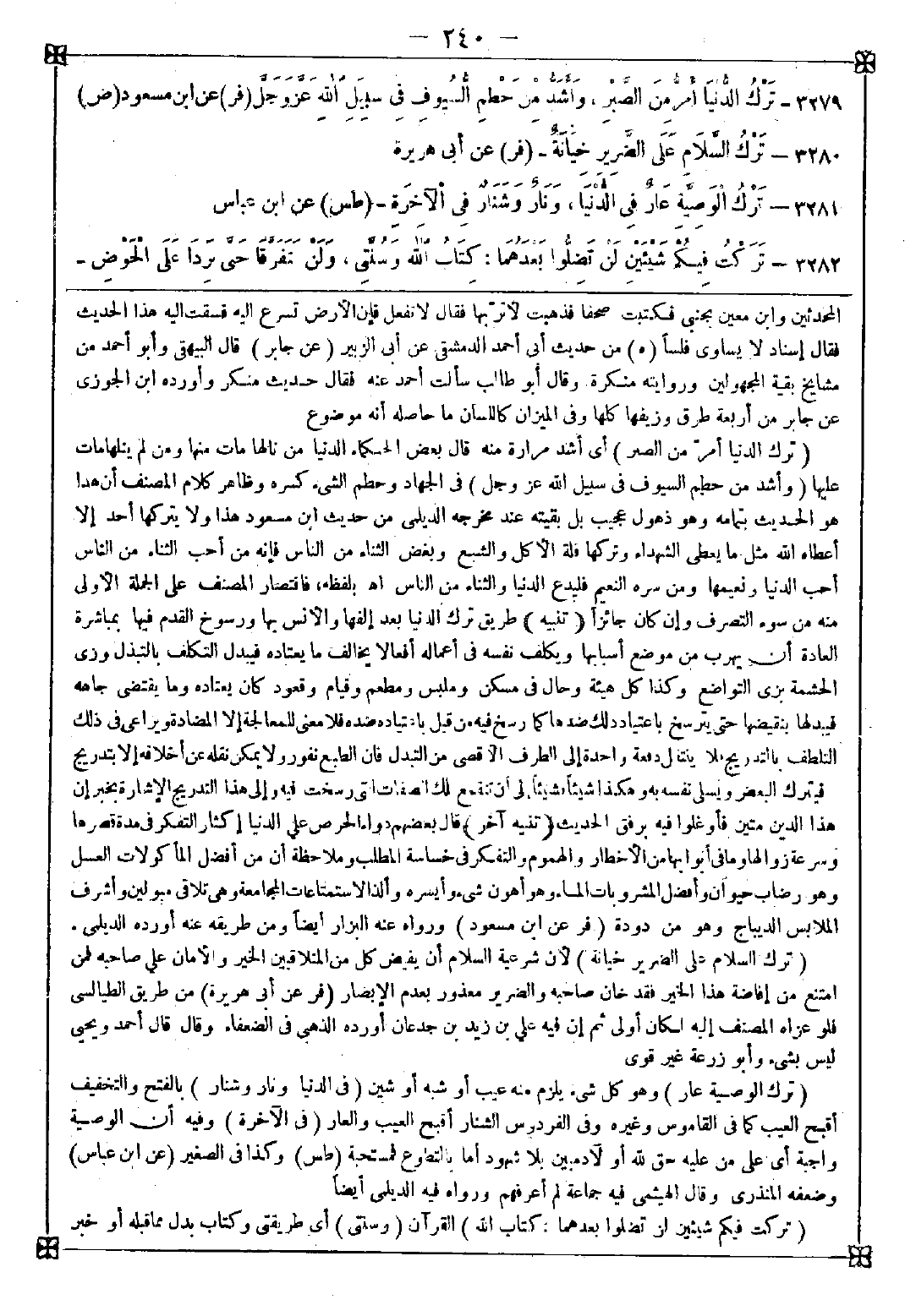 3282 - (تركت فيكم شيئين لن تضلوا بعدهما كتاب الله) القرآن (وسنتي) أي طريقتي وكتاب بدل مما قبله أو خبر -[241]- لمحذوف أي وهما إلخ (ولن يتفرقا حتى يردا على الحوض) قد مر بيانه موضحا بما منه أنهما الأصلان اللذان لا عدول عنهما ولا هدى إلا منهما والعصمة والنجاة لمن تمسك بهما واعتصم بحبلهما وهما الفرقان الواضح والبرهان اللائح بين المحق إذا اقتفاهما والمبطل إذا خلاهما فوجوب الرجوع إلى الكتاب والسنة متعين معلوم من الدين بالضرورة لكن القرآن يحصل به العلم القطعي يقينا وفي السنة تفصيل معروف والمحصول مبسوط في الأصول