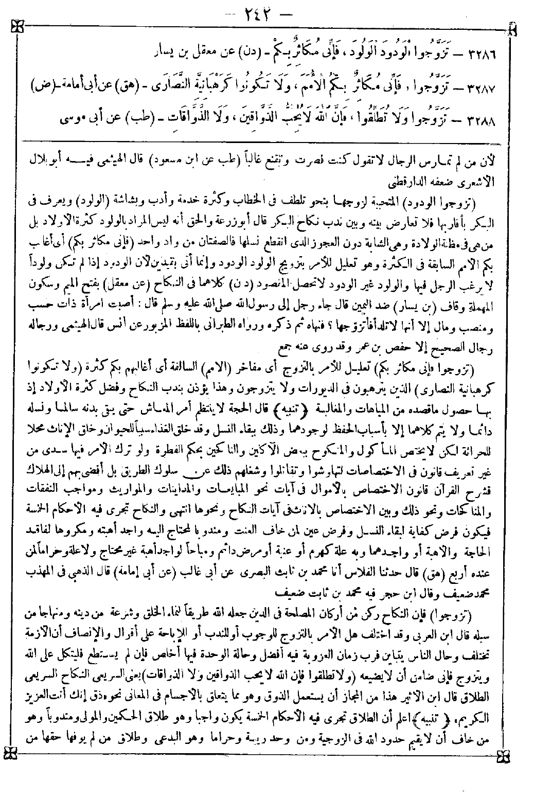 3287 - (تزوجوا فإني مكاثر بكم) تعليل للأمر بالتزوج أي مفاخر (الأمم) السالفة أي أغالبهم بكم كثرة (ولا تكونوا كرهبانية النصارى) الذين يترهبون في الديورات ولا يتزوجون وهذا يؤذن بندب النكاح وفضل كثرة الأولاد إذ بها حصول ما قصده من المباهاة والمغالبة. <تنبيه> قال الحجة: لا ينتظم أمر المعاش حتى يبقى بدنه سالما ونسله دائما ولا يتم كلاهما إلا بأسباب الحفظ لوجودهما وذلك ببقاء النسل وقد خلق الغذاء سببا للحيوان وخلق الإناث محلا للحراثة لكن لا يختص المأكول والمنكوح ببعض الآكلين والناكحين بحكم الفطرة ولو ترك الأمر فيها سدى من غير تعريف قانون في الاختصاصات لتهاوشوا وتقاتلوا وشغلهم ذلك عن سلوك الطريق بل أفضى بهم إلى الهلاك فشرح القرآن قانون الاختصاص بالأموال في آيات نحو المبايعات والمداينات والمواريث ومواجب النفقات والمناكحات ونحو ذلك وبين الاختصاص بالإناث في آيات النكاح ونحوها انتهى والنكاح تجري فيه الأحكام الخمسة فيكون فرض كفاية لبقاء النسل وفرض عين لمن خاف العنت ومندوبا لمحتاج إليه واجد أهبته ومكروها لفاقد الحاجة والأهبة أو واجدهما وبه علة كهرم أو عنة أو مرض دائم ومباحا لواجد أهبة غير محتاج ولا علة وحراما لمن عنده أربع