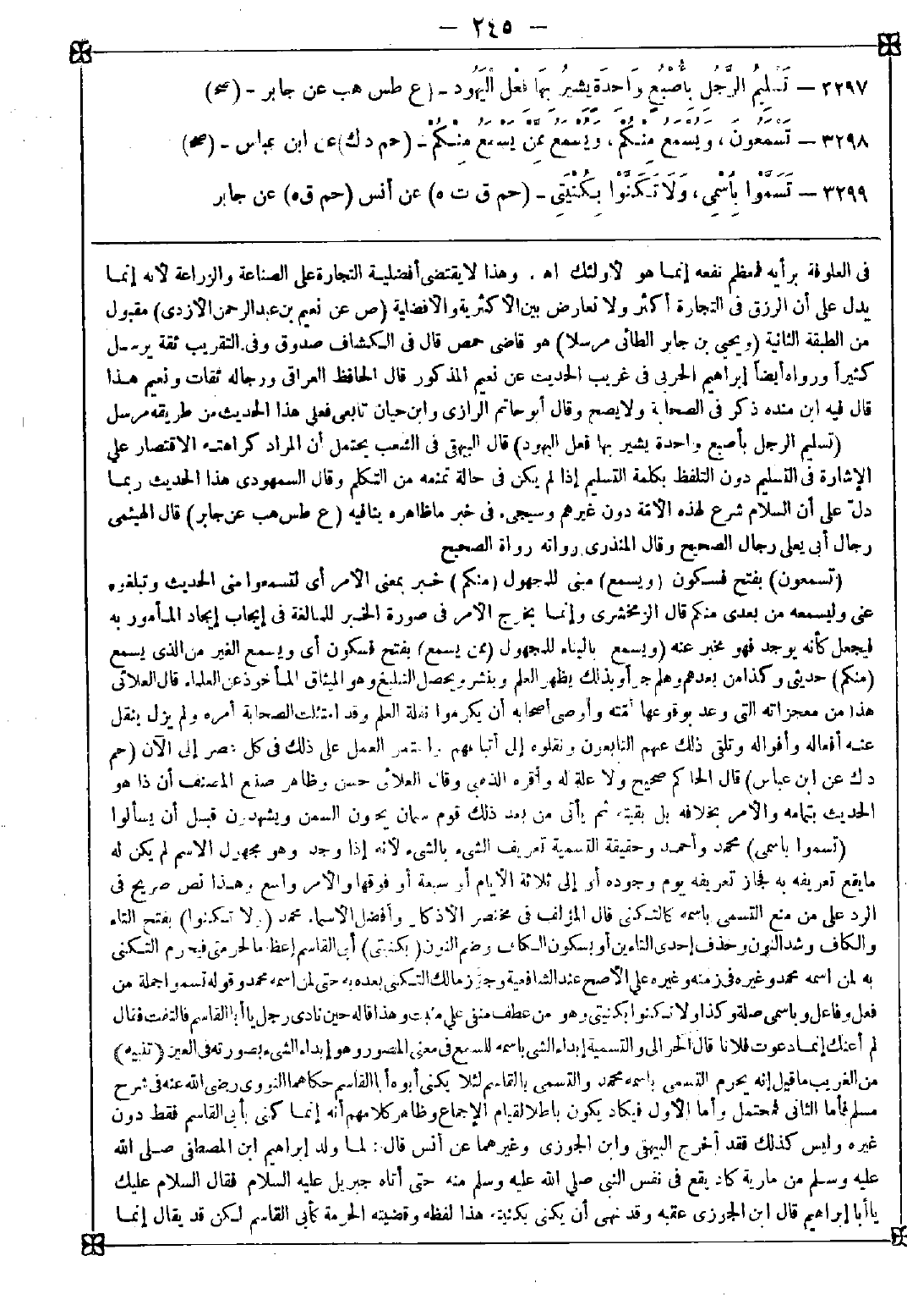 3299 - (تسموا باسمي) محمد وأحمد وحقيقة التسمية تعريف الشيء بالشيء لأنه إذا وجد وهو مجهول الاسم لم يكن له ما يقع تعريفه به فجاز تعريفه يوم وجوده أو إلى ثلاثة أيام أو سبعة أو فوقها والأمر واسع وهذا نص صريح في الرد على من منع التسمي باسمه كالتكني قال المؤلف في مختصر الأذكار وأفضل الأسماء محمد (ولا تكنوا) بفتح التاء والكاف وشد النون وحذف إحدى التاءين أو بسكون الكاف وضم النون (بكنيتي) أي القاسم إعظاما لحرمتي فيحرم التكني به لمن اسمه محمد وغيره في زمنه وغيره على الأصح عند الشافعية وجوز مالك التكني بعده به حتى لمن اسمه محمد وقوله تسموا جملة من فعل وفاعل وباسمي صلة وكذا ولا تكنوا بكنيتي وهو من عطف منفي على مثبت وهذا قاله حين نادى رجل يا أبا القاسم فالتفت فقال لم أعنك إنما دعوت فلانا قال الحرالي: والتسمية إبداء الشيء باسمه للسمع في معنى المصور وهو إبداء الشيء بصورته في العين. <تنبيه> من الغريب ما قيل إنه يحرم التسمي باسمه محمد والتسمي بالقاسم لئلا يكنى أبوه أبا القاسم حكاهما النووي رضي الله عنه في شرح مسلم فأما الثاني فمحتمل وأما الأول فيكاد يكون باطلا لقيام الإجماع وظاهر كلامهم أنه إنما كنى بأبي القاسم فقط دون غيره وليس كذلك فقد أخرج البيهقي وابن الجوزي وغيرهما عن أنس قال: لما ولد إبراهيم ابن المصطفى صلى الله عليه وسلم من مارية كاد يقع في نفس النبي صلى الله عليه وسلم منه حتى أتاه جبريل عليه السلام فقال: السلام عليك يا أبا إبراهيم قال ابن الجوزي عقبه وقد نهى أن يكنى بكنيته هذا لفظه وقضيته الحرمة كأبي القاسم لكن قد يقال إنما -[246]- حرم بأبي القاسم لأنه كان ينادى به لكونه أول ولد ولد له فاشتهر به ولم يكن يدعى بأبي إبراهيم