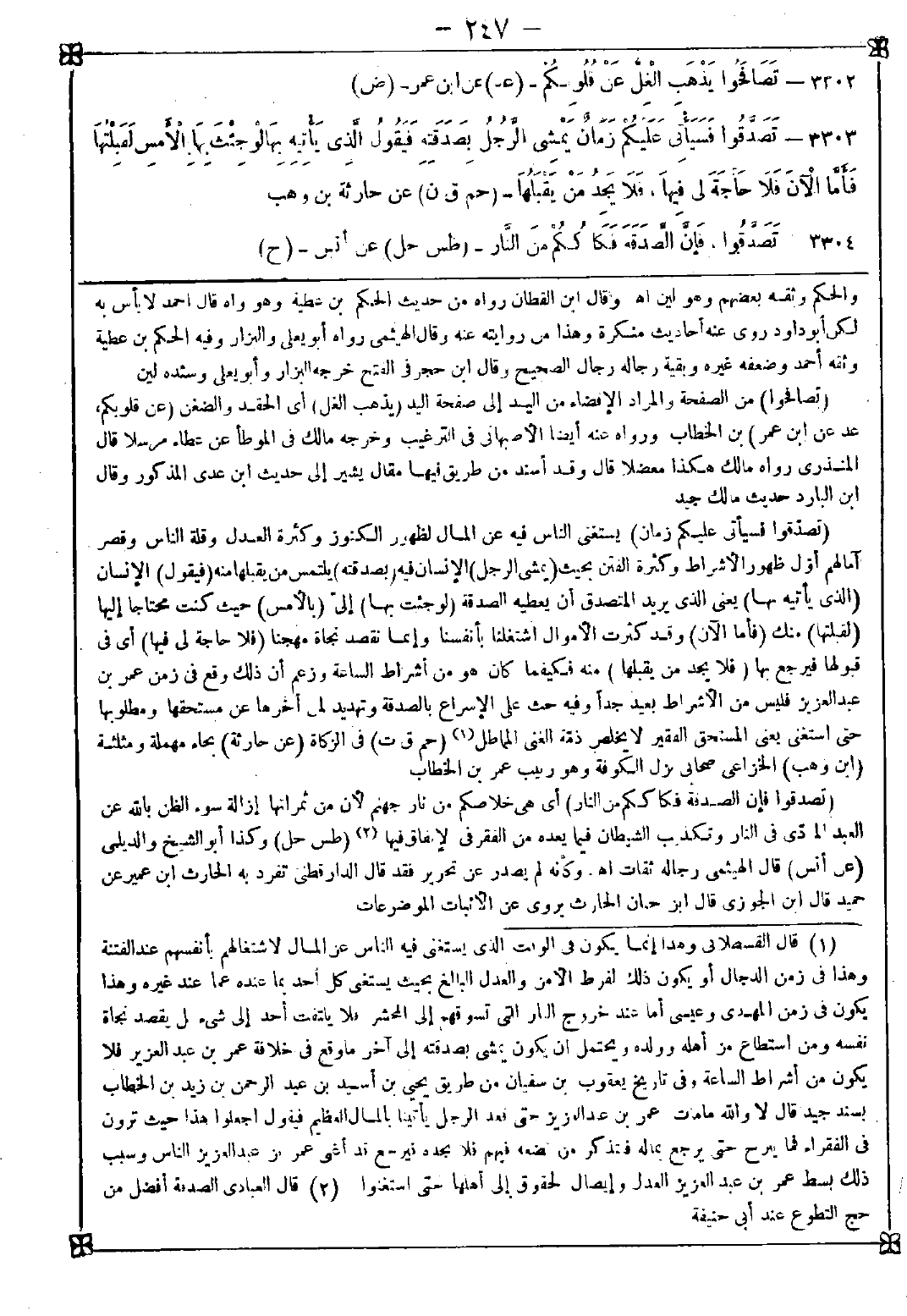 3303 - (تصدقوا فسيأتي عليكم زمان) يستغني الناس فيه عن المال لظهور الكنوز وكثرة العدل وقلة الناس وقصر آمالهم أول ظهور الأشراط وكثرة الفتن بحيث (يمشي الرجل) الإنسان فيه (بصدقته) يلتمس من يقبلها منه (فيقول) الإنسان (الذي يأتيه بها) يعني الذي يريد المتصدق أن يعطيه الصدقة (لو جئت بها) إلي (بالأمس) حيث كنت محتاجا إليها (لقبلتها) منك (فأما الآن) وقد كثرت الأموال اشتغلنا بأنفسنا وإنما نقصد نجاة مهجنا (فلا حاجة لي فيها) أي في قبولها فيرجع بها (فلا يجد من يقبلها) منه فكيفما كان هو من أشراط الساعة وزعم أن ذلك وقع في زمن عمر بن عبد العزيز فليس من الأشراط بعيد جدا وفيه حث على الإسراع بالصدقة وتهديد لمن أخرها عن مستحقها ومطلوبها حتى استغنى يعني المستحق الفقير لا يخلص ذمة الغني المماطل (1)