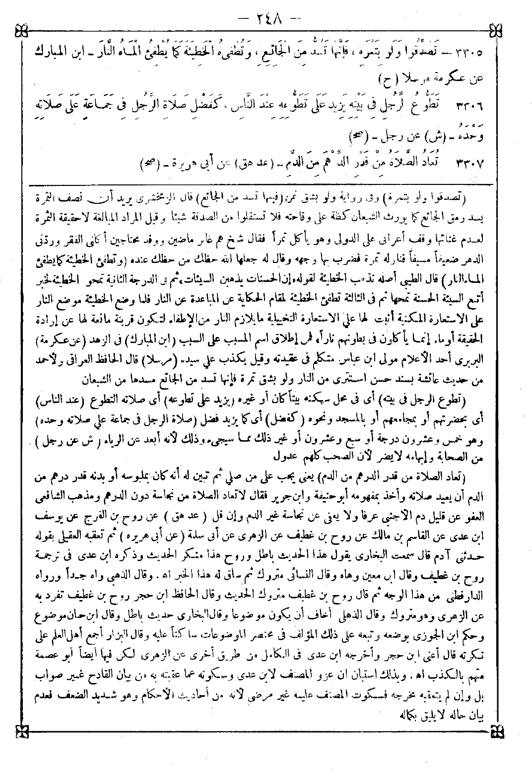 3307 - (تعاد الصلاة من قدر الدرهم من الدم) يعني يجب على من صلى ثم تبين له أنه كان بملبوسه أو بدنه قدر درهم من الدم أن يعيد صلاته وأخذ بمفهومه أبو حنيفة وابن جرير فقال: لا تعاد الصلاة من نجاسة دون الدرهم ومذهب الشافعي العفو عن قليل دم الأجنبي عرفا ولا يعفى عن نجاسة غير الدم وإن قل