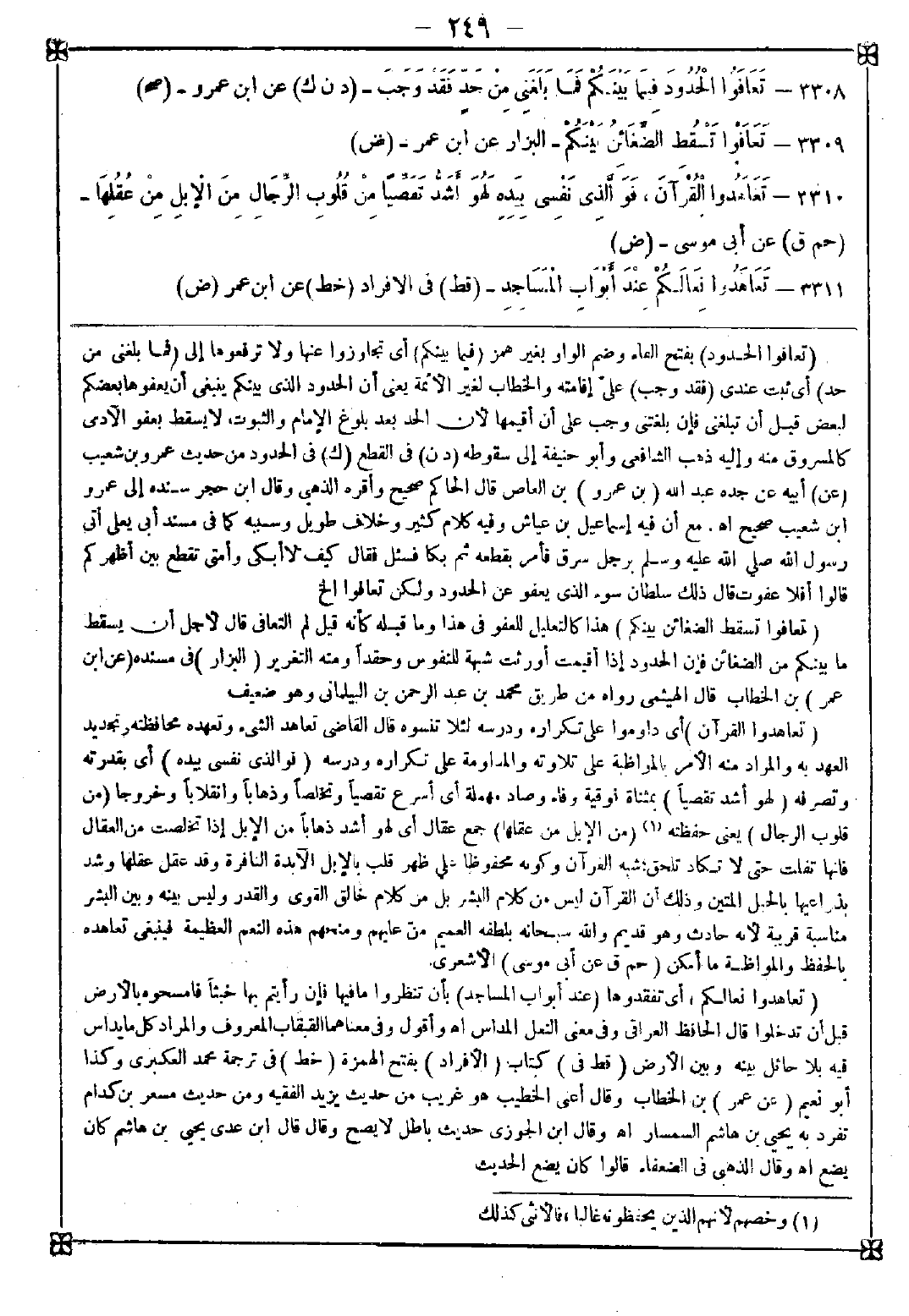 -[249]- 3308 - (تعافوا الحدود) بفتح التاء وضم الواو بغير همز (فيما بينكم) أي تجاوزوا عنها ولا ترفعوها إلي (فما بلغني من حد) أي ثبت عندي (فقد وجب) علي إقامته والخطاب لغير الأئمة يعني أن الحدود الذي بينكم ينبغي أن يعفوها بعضكم لبعض قبل أن تبلغني فإن بلغتني وجب علي أن أقيمها لأن الحد بعد بلوغ الإمام والثبوت لا يسقط بعفو الآدمي كالمسروق منه وإليه ذهب الشافعي وأبو حنيفة إلى سقوطه
