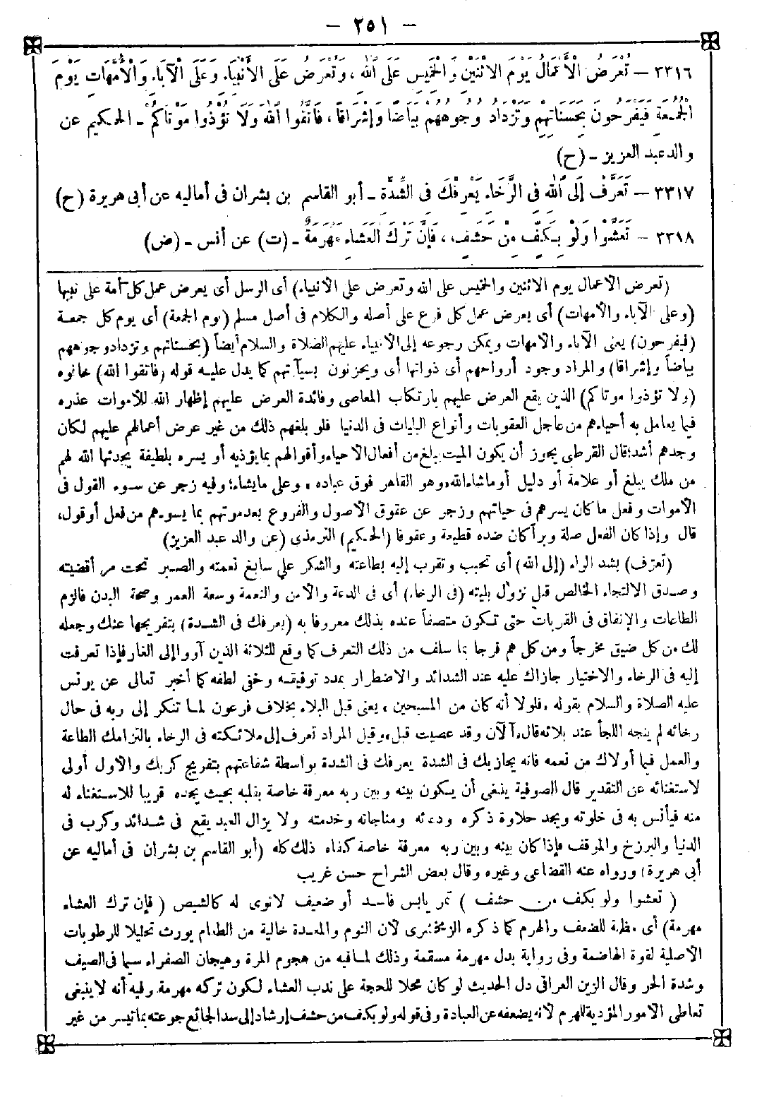 -[251]- 3316 - (تعرض الأعمال يوم الاثنين والخميس على الله وتعرض على الأنبياء) أي الرسل أي يعرض عمل كل أمة على نبيها (وعلى الآباء والأمهات) أي يعرض عمل كل فرع على أصله والكلام في أصل مسلم (يوم الجمعة) أي يوم كل جمعة (فيفرحون) يعني الآباء والأمهات ويمكن رجوعه إلى الأنبياء عليهم الصلاة والسلام أيضا (بحسناتهم وتزداد وجوههم بياضا وإشراقا) والمراد وجود أرواحهم أي ذواتها أي ويحزنون بسيئاتهم كما يدل عليه قوله (فاتقوا الله) خافوه (ولا تؤذوا موتاكم) الذين يقع العرض عليهم بارتكاب المعاصي وفائدة العرض عليهم إظهار الله للأموات عذره فيما يعامل به أحياءهم من عاجل العقوبات وأنواع البليات في الدنيا فلو بلغهم ذلك من غير عرض أعمالهم عليهم لكان وجدهم أشد قال القرطبي: يجوز أن يكون الميت يبلغ من أفعال الأحياء وأقوالهم ما يؤذيه أو يسره بلطيفة يحدثها الله لهم من ملك يبلغ أو علامة أو دليل أو ما شاء الله {وهو القاهر فوق عباده} وعلى ما يشاء وفيه زجر عن سوء القول في الأموات وفعل ما كان يسرهم في حياتهم وزجر عن عقوق الأصول والفروع بعد موتهم بما يسوءهم من فعل أو قول قال: وإذا كان الفعل صلة وبرا كان ضده قطيعة وعقوقا