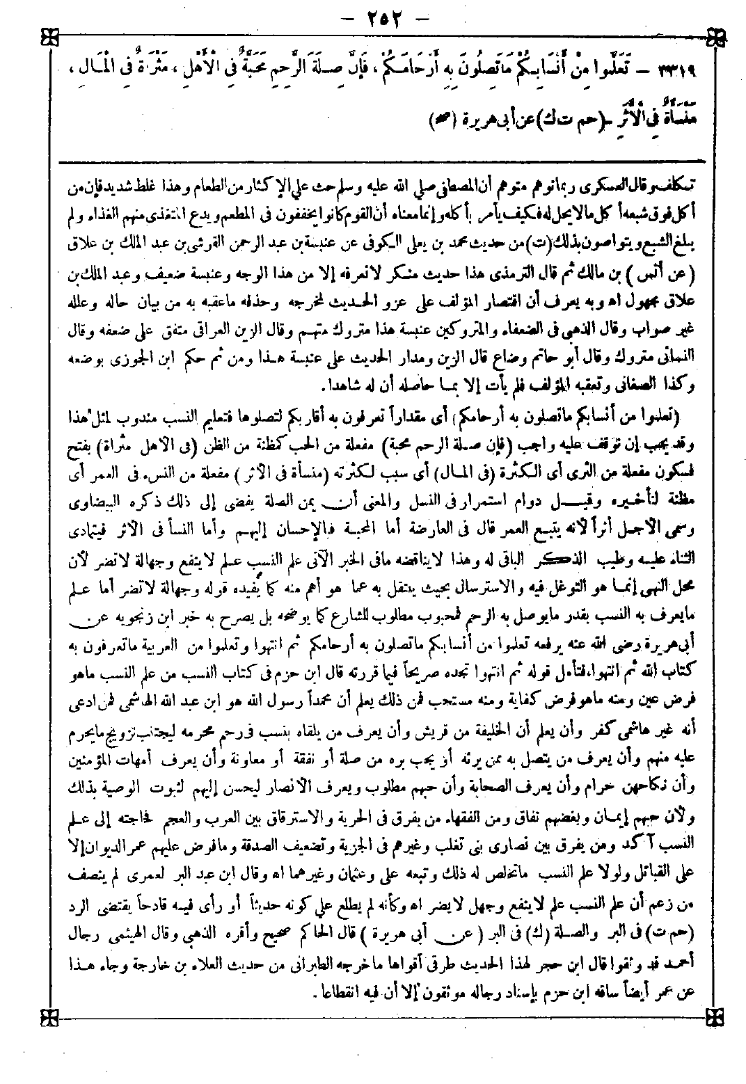3319 - (تعلموا من أنسابكم ما تصلون به أرحامكم) أي مقدارا تعرفون به أقاربكم لتصلوها فتعليم النسب مندوب لمثل هذا وقد يجب إن توقف عليه واجب (فإن صلة الرحم محبة) مفعلة من الحب كمظنة من الظن (في الأهل مثراة) بفتح فسكون مفعلة من الثرى أي الكثرة (في المال) أي سبب لكثرته (منسأة في الأثر) مفعلة من النسء في العمر أي مظنة لتأخيره وقيل دوام استمرار في النسل والمعنى أن يمن الصلة يفضي إلى ذلك ذكره البيضاوي وسمى الأجل أثرا لأنه يتبع العمر قال في العارضة: أما المحبة فالإحسان إليهم وأما النسأ في الأثر فيتمادى الثناء عليه وطيب الذكر الباقي له وهذا لا يناقضه ما في الخبر الآتي علم النسب علم لا ينفع وجهالة لا تضر لأن محل النهي إنما هو التوغل فيه والاسترسال بحيث ينتقل به عما هو أهم منه كما يفيده قوله وجهالة لا تضر أما علم ما يعرف به النسب بقدر ما يوصل به الرحم فمحبوب مطلوب للشارع كما يوضحه بل يصرح به خبر ابن زنجويه عن أبي هريرة رضي الله عنه يرفعه تعلموا من أنسابكم ما تصلون به أرحامكم ثم انتهوا وتعلموا من العريبة ما تعرفون به كتاب الله ثم انتهوا فتأمل قوله ثم انتهوا تجده صريحا فيما قررته قال ابن حزم في كتاب النسب: من علم النسب ما هو فرض عين ومنه ما هو فرض كفاية ومنه مستحب فمن ذلك يعلم أن محمدا رسول الله هو ابن عبد الله الهاشمي فمن ادعى أنه غير هاشمي كفر وأن يعلم أن الخليفة من قريش وأن يعرف من يلقاه بنسب في رحم محرمه ليجتنب تزويج ما يحرم عليه منهم وأن يعرف من يتصل به ممن يرثه أو يجب بره من صلة أو نفقة أو معاونة وأن يعرف أمهات المؤمنين وأن نكاحهن حرام وأن يعرف الصحابة وأن حبهم مطلوب ويعرف الأنصار ليحسن إليهم لثبوت الوصية بذلك ولأن حبهم إيمان وبغضهم نفاق ومن الفقهاء من يفرق في الحرية والاسترقاق بين العرب والعجم فحاجته إلى علم النسب آكد ومن يفرق بين نصارى بني تغلب وغيرهم في الجزية وتضعيف الصدقة وما فرض عليهم عمر الديوان إلا على القبائل ولولا علم النسب ما تخلص له ذلك وتبعه علي وعثمان وغيرهما اه. وقال ابن عبد البر: لعمري لم ينصف من زعم أن علم النسب علم لا ينفع وجهل لا يضر اه وكأنه لم يطلع على كونه حديثا أو رأى فيه قادحا يقتضي الرد