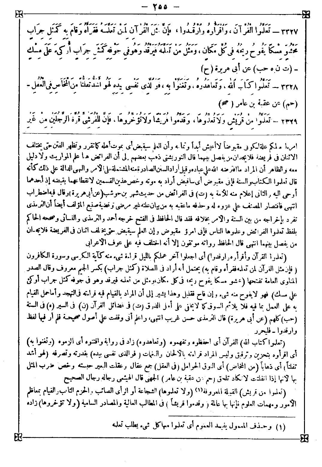 3328 - (تعلموا كتاب الله) القرآن أي احفظوه وتفهموه (وتعاهدوه) زاد في رواية واقتنوه أي الزموه (وتغنوا به) أي اقرأوه بتحزين وترقيق وليس المراد قراءته بالألحان والنغمات (فوالذي نفسي بيده) بقدرته وتصرفه (لهو أشد تفلتا) أي ذهابا (من المخاض) أي النوق الحوامل (في العقل) حمع عقال وعقلت البعير حبسته وخص ضرب المثل بها لأنها إذا انفلتت لا تكاد تلحق