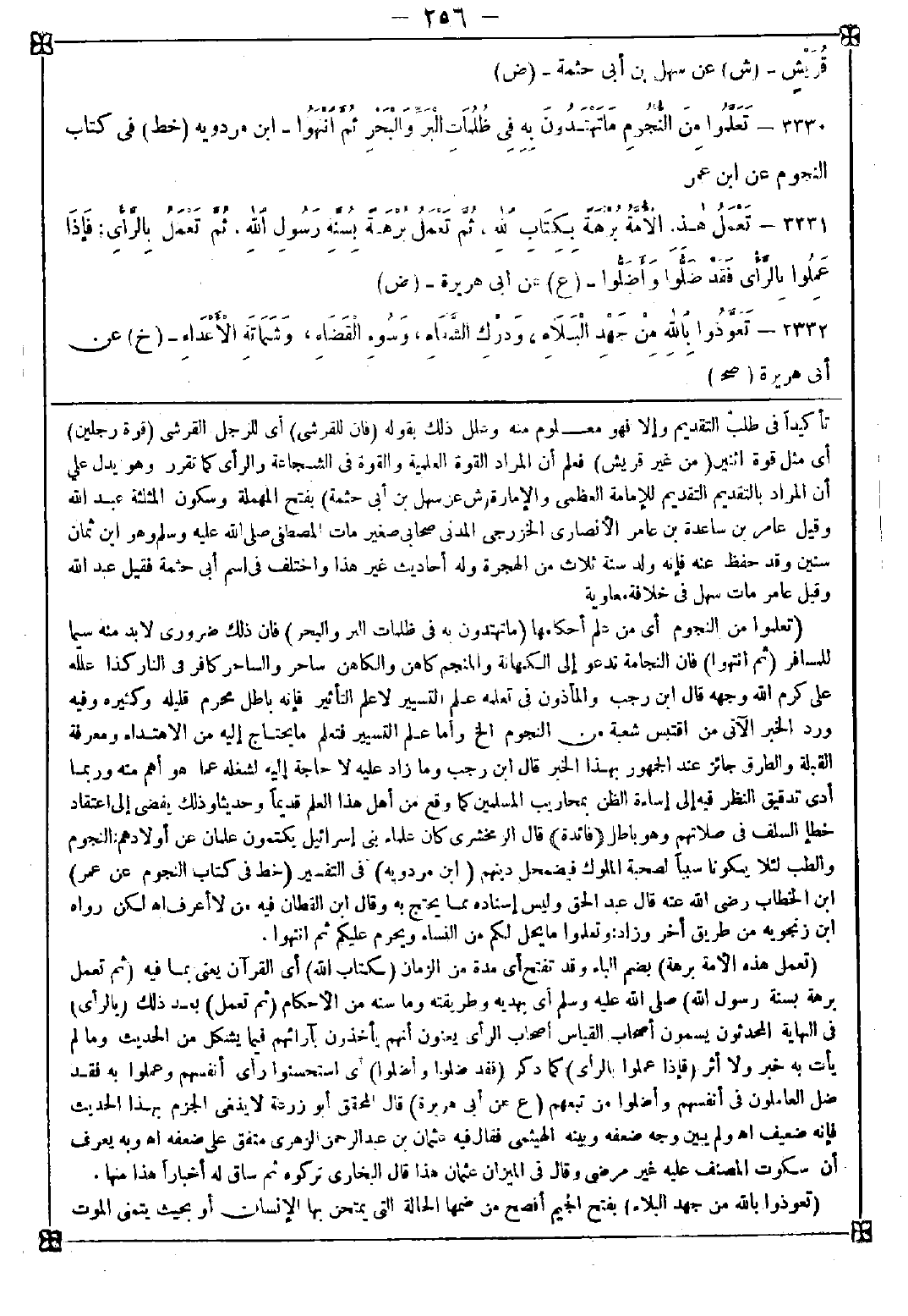 3330 - (تعلموا من النجوم) أي من علم أحكامها (ما تهتدون به في ظلمات البر والبحر) فإن ذلك ضروري لا بد منه سيما للمسافر (ثم انتهوا) فإن النجامة تدعو إلى الكهانة والمنجم كاهن والكاهن ساحر والساحر كافر في النار كذا علله علي كرم الله وجهه قال ابن رجب: والمأذون في تعلمه علم التسيير لا علم التأثير فإنه باطل محرم قليله وكثيره وفيه ورد الخبر الآتي من اقتبس شعبة من النجوم إلخ وأما علم التسيير فتعلم ما يحتاج إليه من الاهتداء ومعرفة القبلة والطرق جائز عند الجمهور بهذا الخبر قال ابن رجب: وما زاد عليه لا حاجة إليه لشغله عما هو أهم منه وربما أدى تدقيق النظر فيه إلى إساءة الظن بمحاريب المسلمين كما وقع من أهل هذا العلم قديما وحديثا وذلك يفضي إلى اعتقاد خطأ السلف في صلاتهم وهو باطل. <فائدة> قال الزمخشري: كان علماء بني إسرائيل يكتمون علمان عن أولادهم: النجوم والطب لئلا يكونا سببا لصحبة الملوك فيضمحل دينهم
