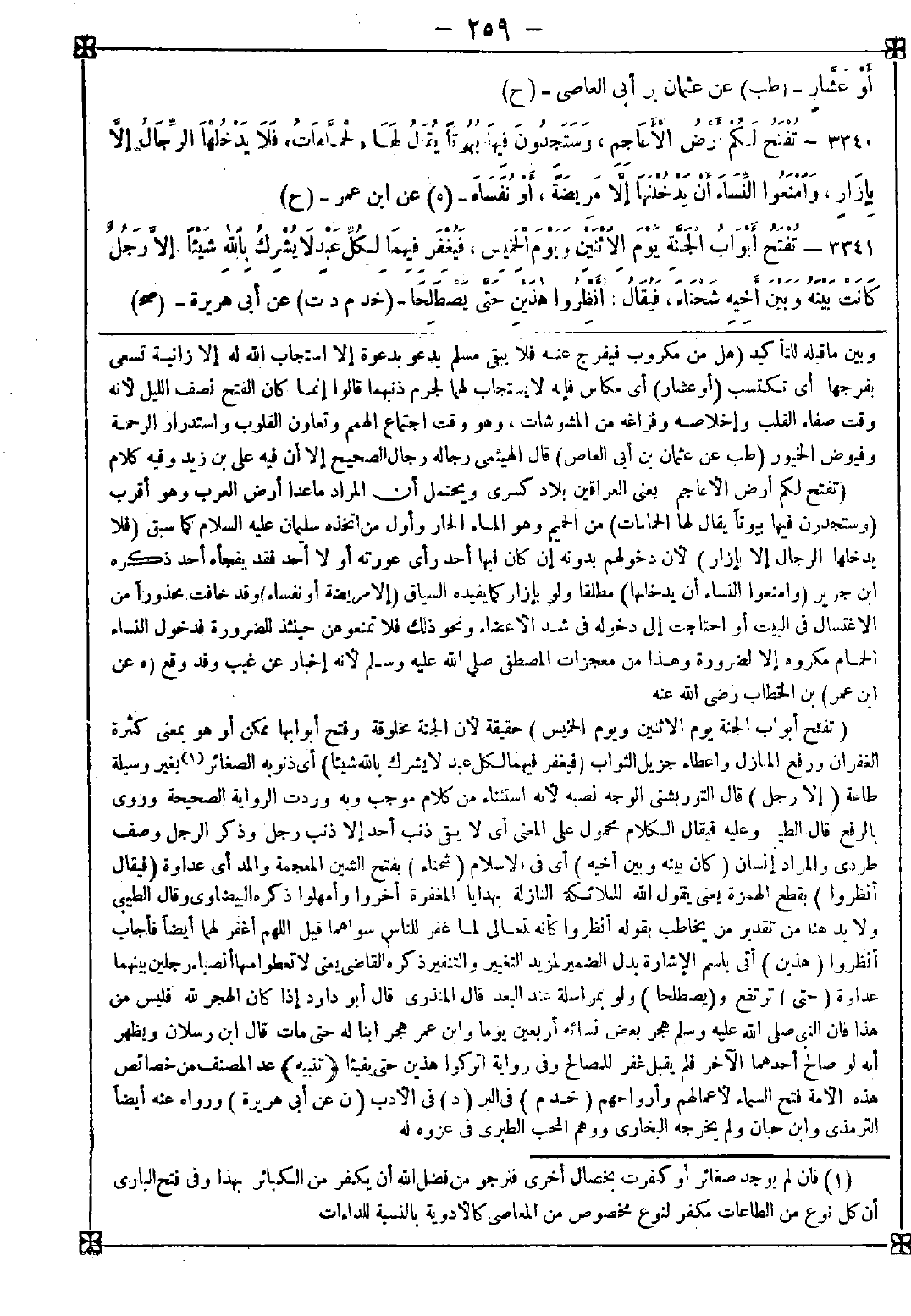 3340 - (تفتح لكم أرض الأعاجم) يعني العراقين بلاد كسرى ويحتمل أن المراد ما عدا أرض العرب وهو أقرب (وستجدون فيها بيوتا يقال لها الحمامات) من الحميم وهو الماء الحار وأول من اتخذه سليمان عليه السلام كما سبق (فلا يدخلها الرجال إلا بإزار) لأن دخولهم بدونه إن كان فيها أحد رأى عورته أو لا أحد فقد يفجأه أحد ذكره ابن جرير (وامنعوا النساء أن يدخلنها) مطلقا ولو بإزار كما يفيده السياق (إلا مريضة أو نفساء) وقد خافت محذورا من الاغتسال في البيت أو احتاجت إلى دخوله في شد الأعضاء ونحو ذلك فلا تمنعونهن حينئذ للضرورة فدخول النساء الحمام مكروه إلا لضرورة وهذا من معجزات المصطفى صلى الله عليه وسلم لأنه إخبار عن غيب وقد وقع