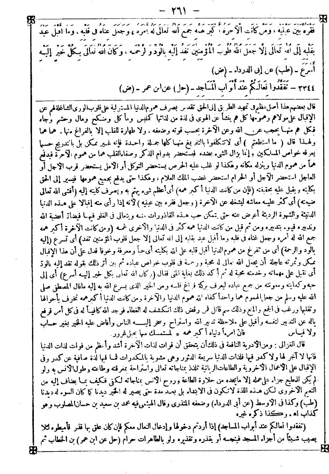 3344 - (تفقدوا نعالكم عند أبواب المساجد) إذا أردتم دخولها وإدخال النعال معكم فإن كان علق بها قذر فأميطوه لئلا يصيب شيئا من أجزاء المسجد فينجسه أو يقذره وتقذيره ولو بالطاهرات حرام