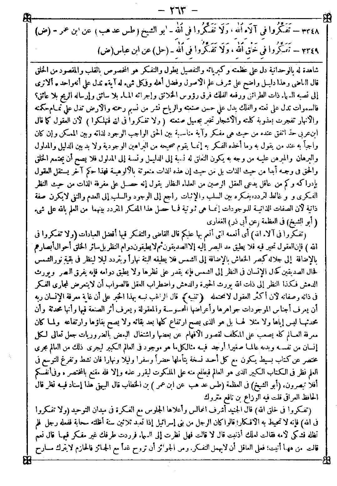 3348 - (تفكروا في آلاء الله) أي أنعمه التي أنعم بها عليكم قال القاضي: والتفكر فيها أفضل العبادات (ولا تفكروا في الله) فإن العقول تحير فيه فلا يطيق مد البصر إليه إلا الصديقون ثم لا يطيقون دوام النظر بل سائر الخلق أحوال أبصارهم بالإضافة إلى جلاله كبصر الخفاش بالإضافة إلى الشمس فلا يطيقه البتة نهارا ويتردد ليلا لينظر في بقية نور الشمس فحال الصديقين كحال الإنسان في النظر إلى الشمس فإنه يقدر على نظرها ولا يطيق دوامه فإنه يفرق البصر ويورث الدهش فكذا النظر إلى ذات الله يورث الحيرة والدهش واضطراب العقل فالصواب أن لا يتعرض لمجاري الفكر في ذاته وصفاته لأن أكثر العقول لا تحتمله. (تنبيه} قال الراغب: نبه بهذا الخبر على أن غاية معرفة الإنسان ربه أن يعرف أجناس الموجودات جواهرها وأعراضها المحسوسة والمعقولة ويعرف أثر الصنعة فيها وأنها محدثة وأن محدثها ليس إياها ولا مثلا لها بل هو الذي يصح ارتفاع كلها بعد بقائه ولا يصح بقاؤها وارتفاعه ولما كان معرفة العالم كله يصعب على المكلف لقصور الأفهام عن بعضها واشتغال البعض بالضروريات جعل تعالى لكل إنسان من نفسه وبدنه عالما صغيرا أوجد فيه مثال كل ما هو موجود في العالم الكبير ليجري ذلك من العالم مجرى مختصر عن كتاب بسيط يكون مع كل أحد نسخة يتأملها حضرا وسفرا وليلا ونهارا فإن نشط وتفرغ للتوسع في العلم نظر في الكتاب الكبير الذي هو العالم فيطلع منه على الملكوت ليقرر علمه وإلا فله مقنع بالمختصر {وفي أنفسكم أفلا تبصرون}