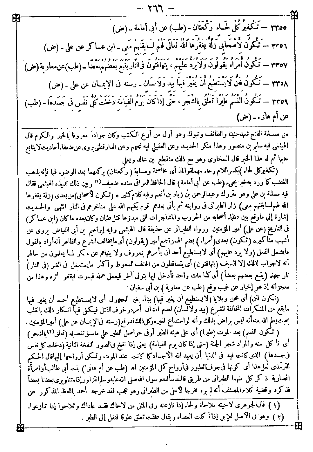 3358 - (تكون فتن) أي محن وبلايا (لا يستطيع أن يغير فيها) ببناء بغير للمجهول أي لا يستطيع أحد أن يغير فيها ما يقع من المنكرات المخالفة للشرع (بيد ولا لسان) لعدم امتثال أمره وخوف القتل فيكفي فيها إنكار ذلك بالقلب بحيث يعلم الله منه أنه ليس براض بذلك وأنه لو استطاع لغيره وكل ذلك قد وقع